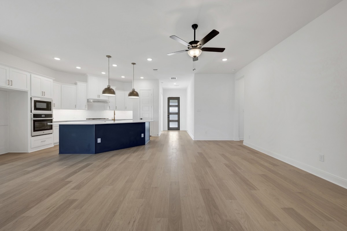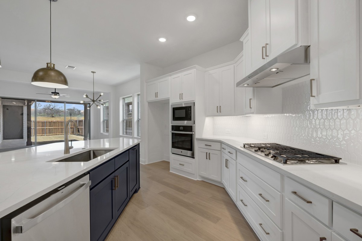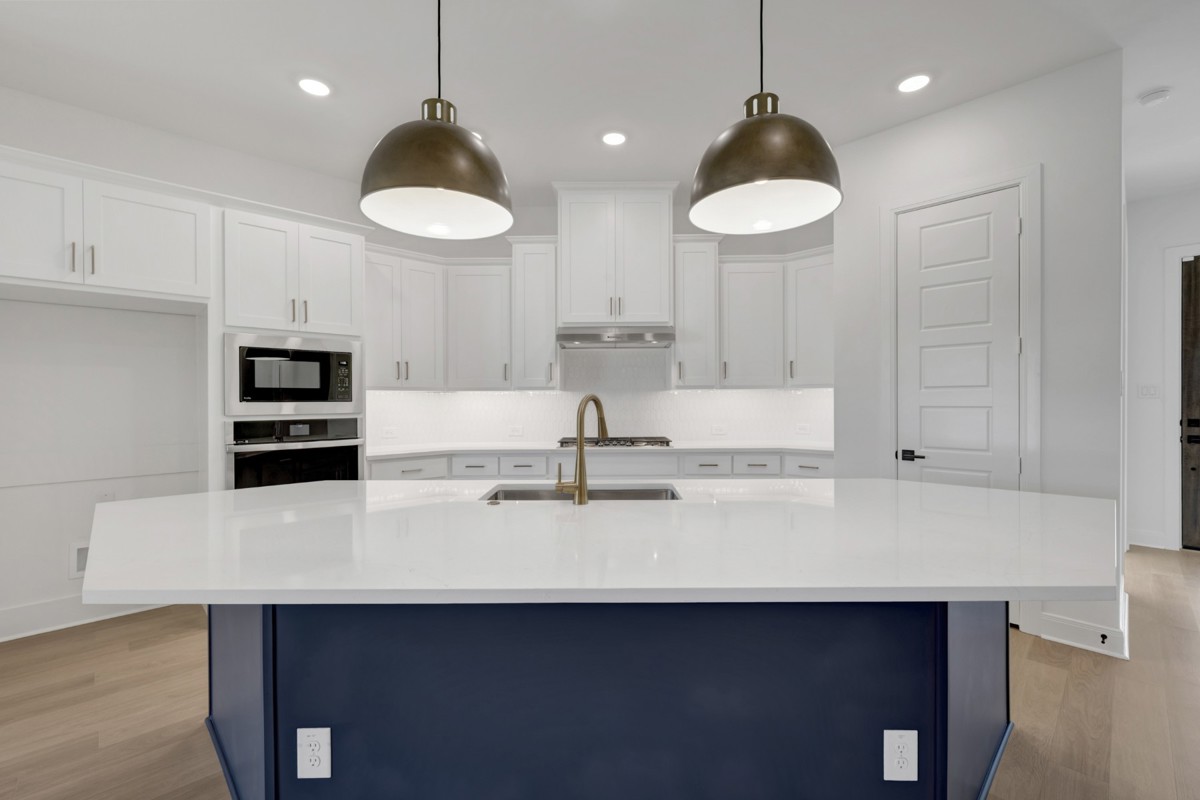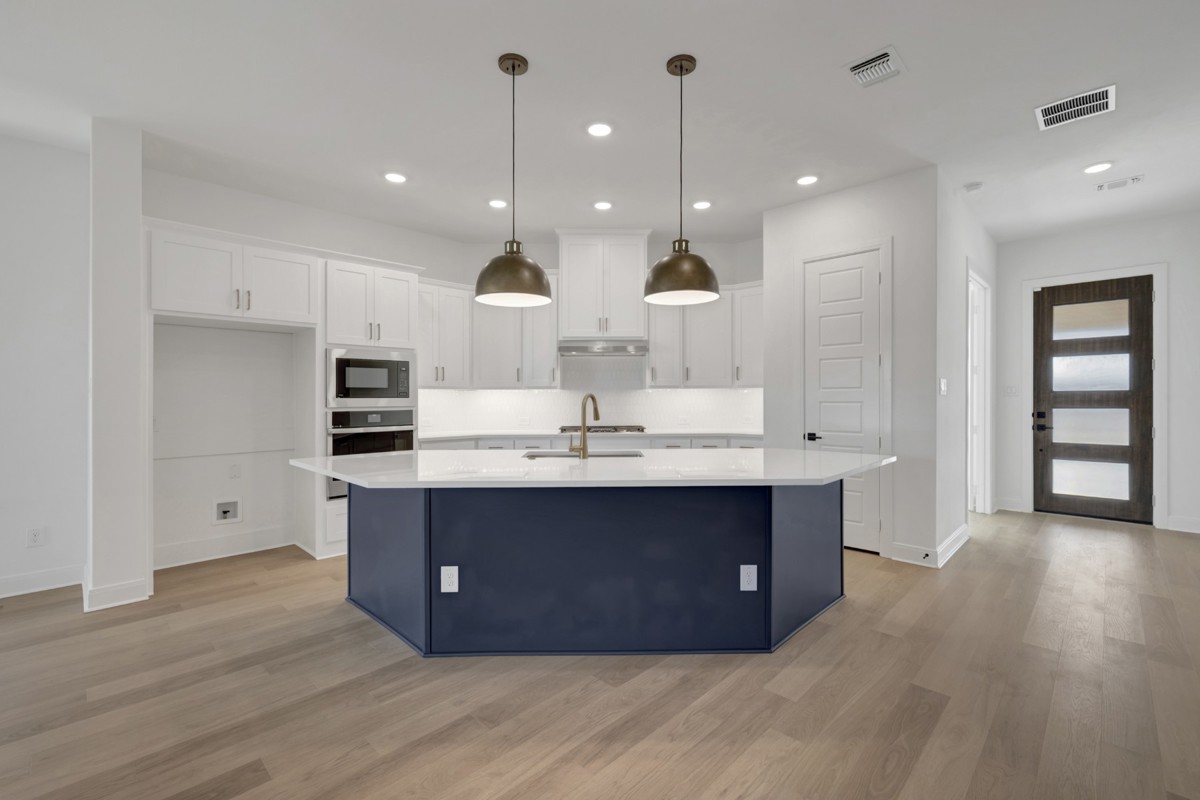 Step into The Bluebonnet, where timeless elegance meets thoughtful design in the heart of Viridian. The bright, open interior welcomes you with crisp white cabinetry that creates a clean and inviting backdrop. At the center of the home, an accented blue island adds personality and charm, beautifully complemented by warm gold finishes that bring sophistication and balance to the space.