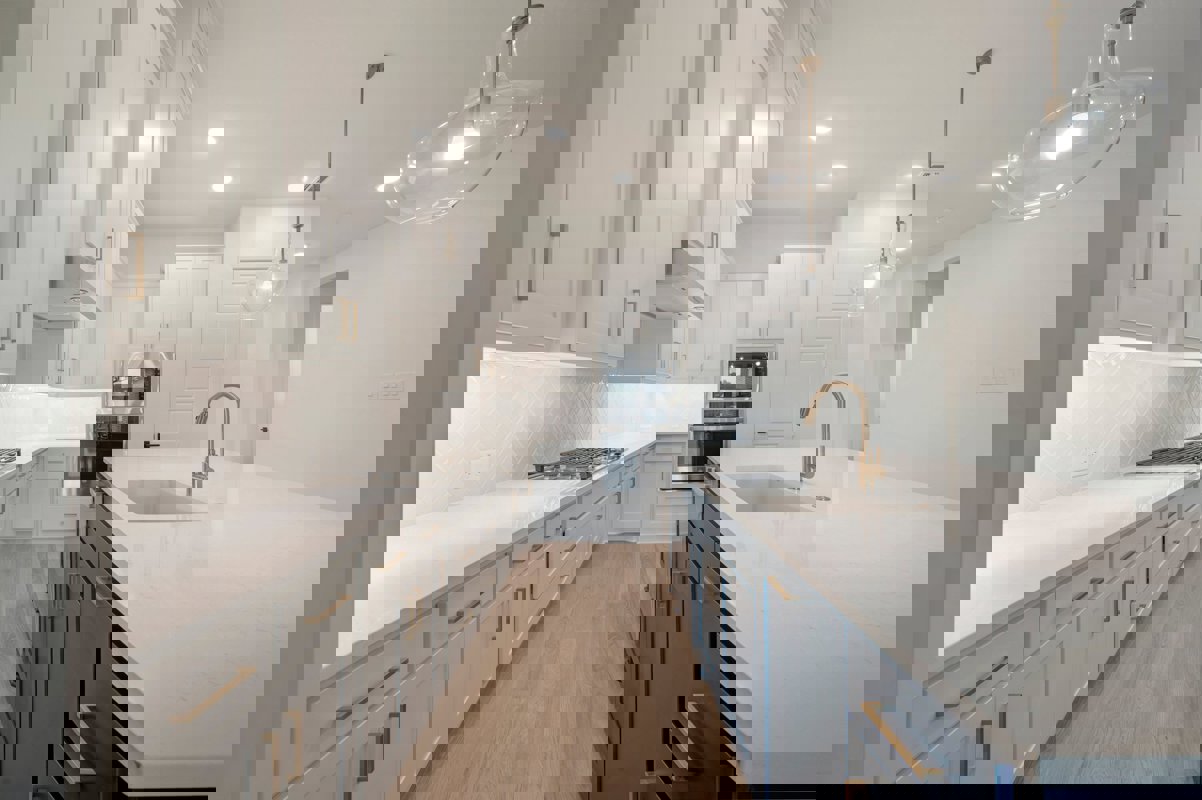 Warm metallic accents in the faucet and lighting introduce understated luxury, and a farmhouse style sink blends charm with functionality. These elements come together to create a space that is both beautiful and practical.