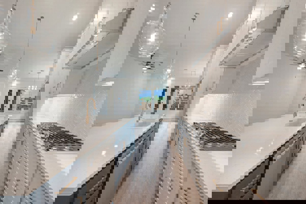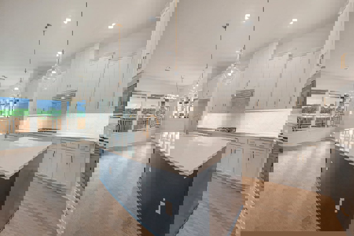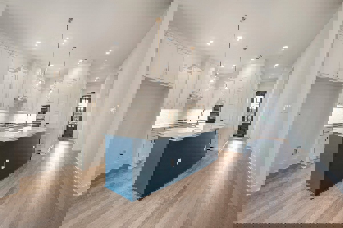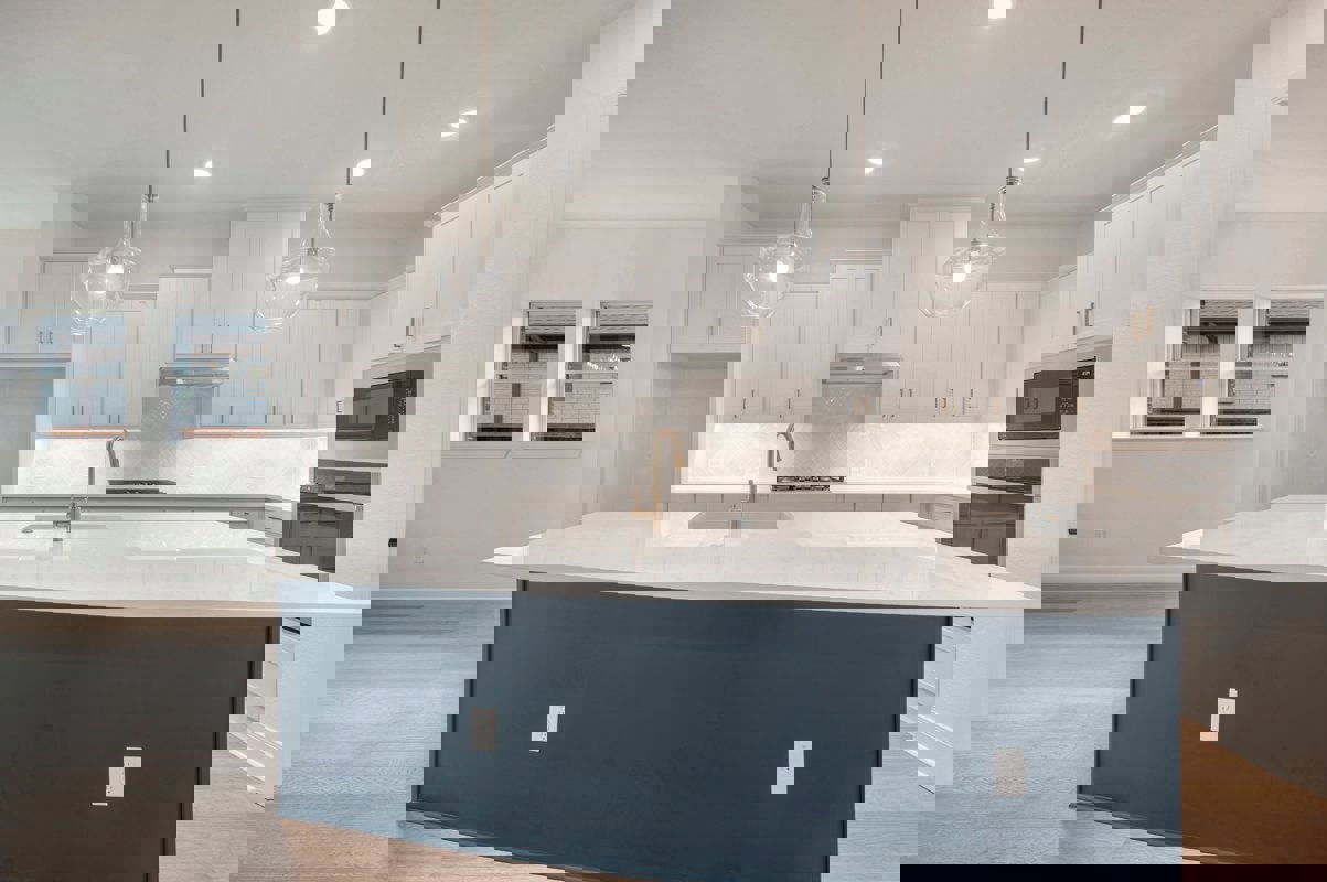 The kitchen serves as a statement space with a Smokey Blue island paired with soft neutral cabinetry for a balanced and elevated look. Quartz countertops provide timeless appeal, while a herringbone backsplash adds subtle texture and visual interest.