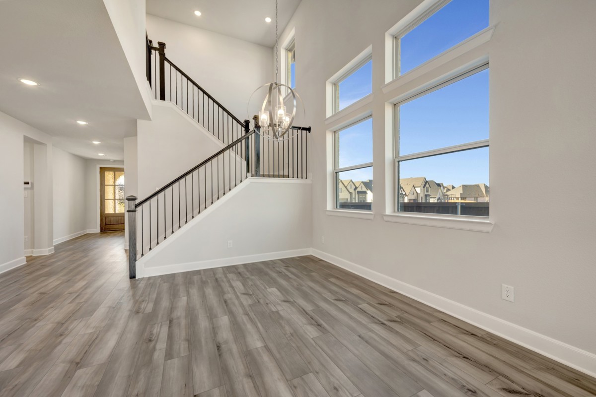 This stunning home in Sandbrock Ranch perfectly blends luxury and functionality, with design elements that emphasize both comfort and elegance. Upon entry, you are welcomed by soaring eighteen foot ceilings in the formal dining room, setting the tone for the spacious and open layout.