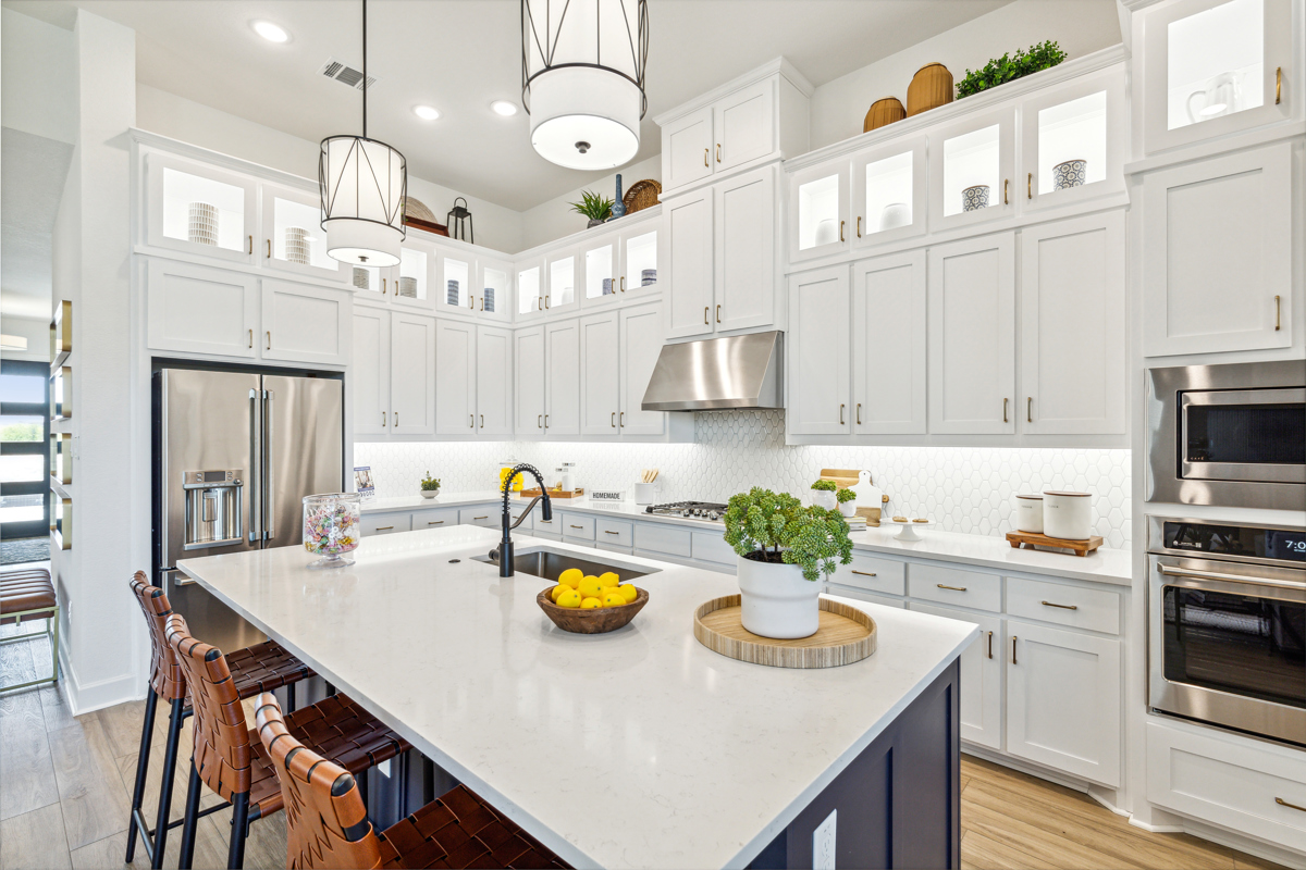 Inside, you’re welcomed by a bright, open-concept layout with soaring ceilings and an abundance of natural light. The heart of the home is the showstopping kitchen, featuring stacked white cabinetry to the ceiling, a bold navy island, designer lighting, and an oversized island perfect for gathering and entertaining. The space flows effortlessly into the family and dining areas, creating an ideal setting for everyday living and special occasions.