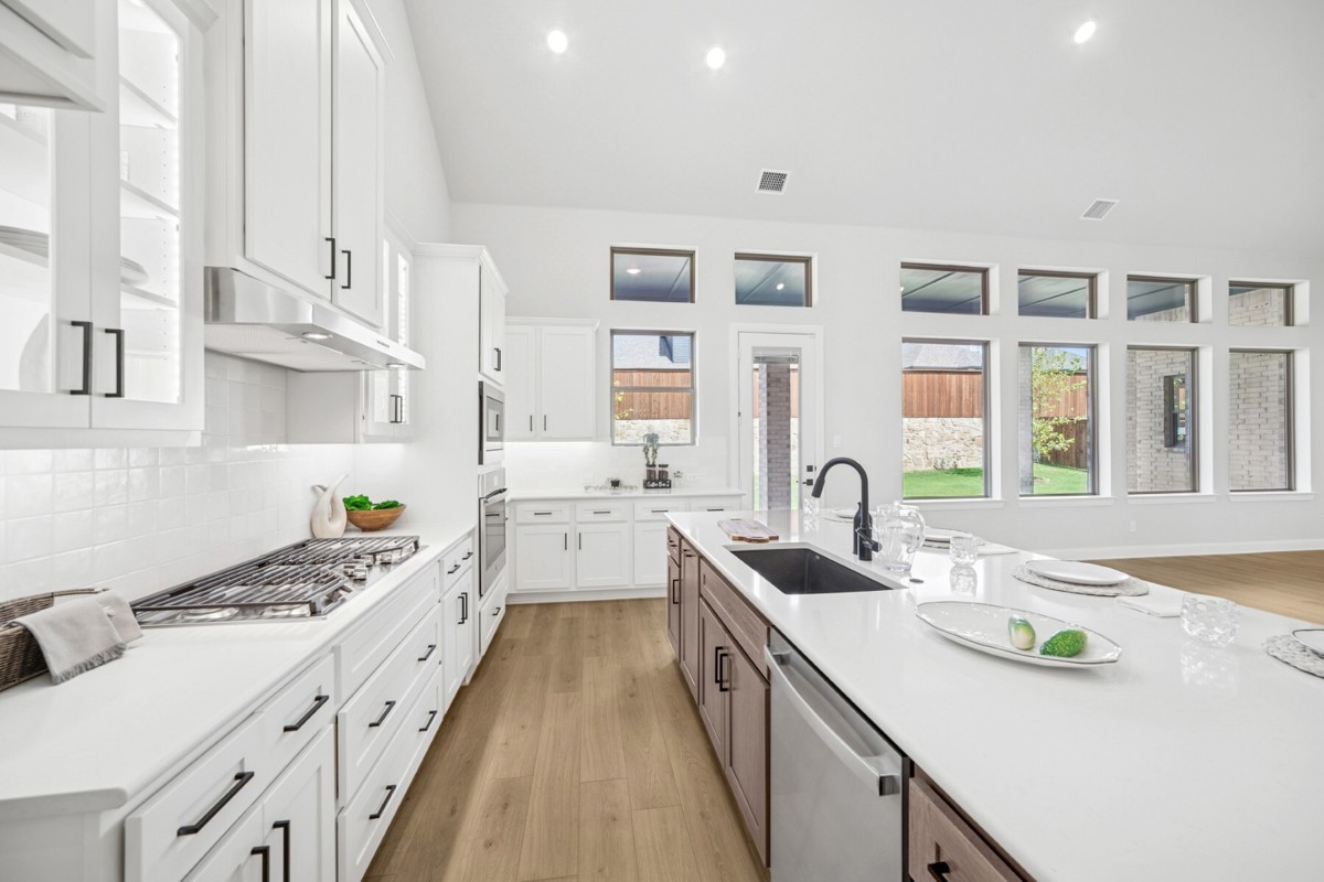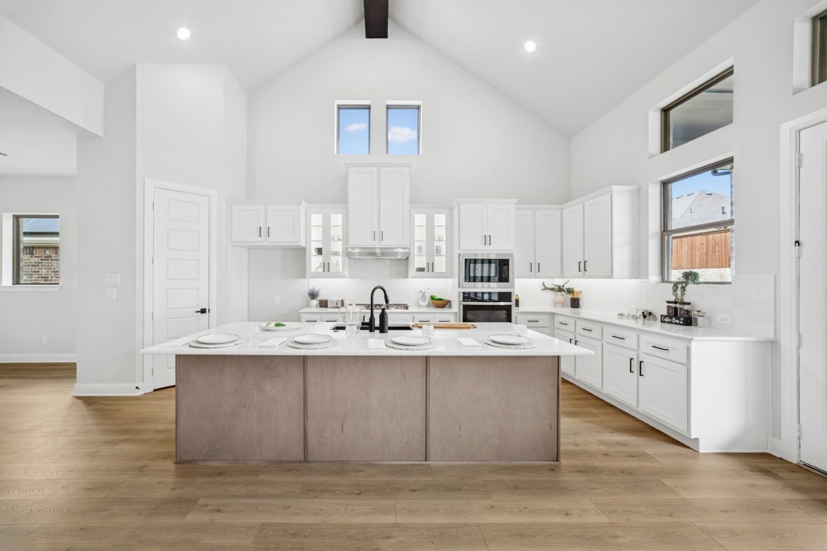 Inside, you’ll be welcomed by soaring 18-foot Cathedral Ceilings and sun-filled Living spaces thanks to oversized windows in the main areas and Owner’s Retreat. The open-concept layout connects the Family Room, Dining Area, Kitchen, and Extended Covered Patio creating the perfect space for entertaining. The gourmet kitchen includes a large island, abundant cabinetry, and a Walk-in Pantry.