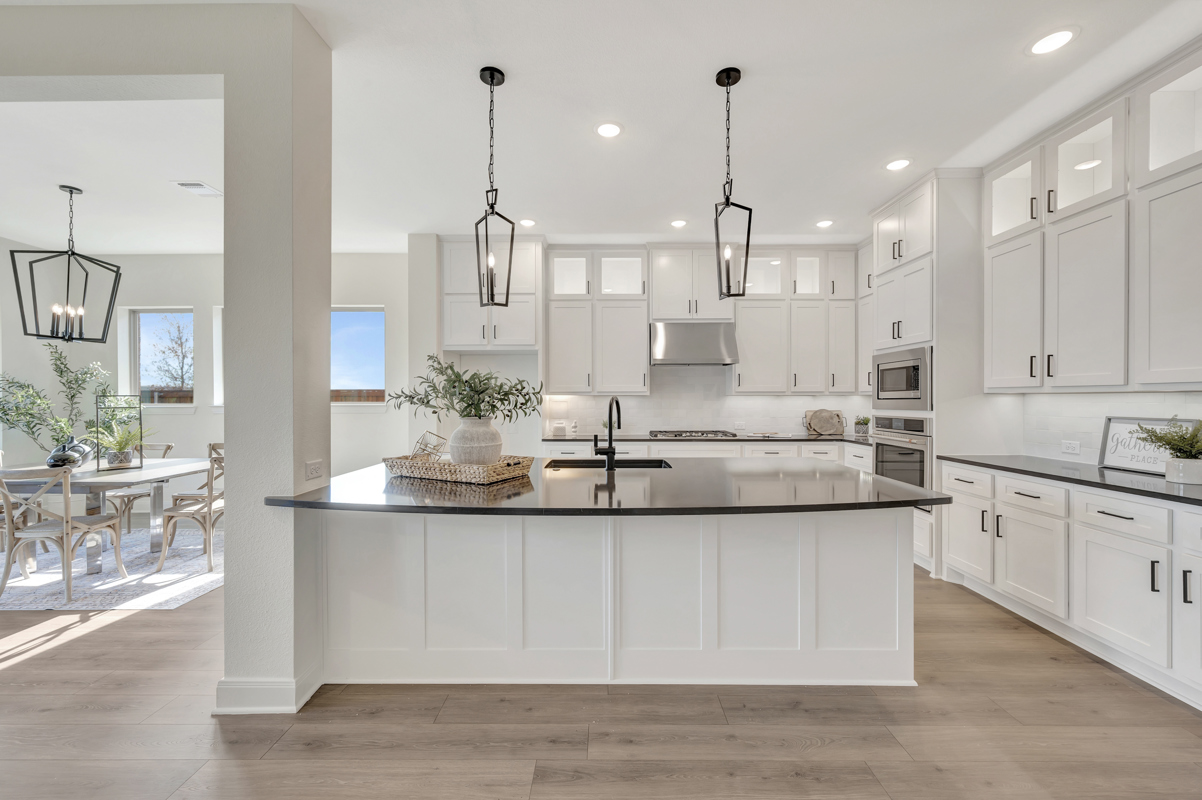 The open-concept floor plan in this David Weekley home offers the interior design freedom to create your ideal space. Explore culinary delights and collaborative cuisine experiences in the gourmet kitchen.