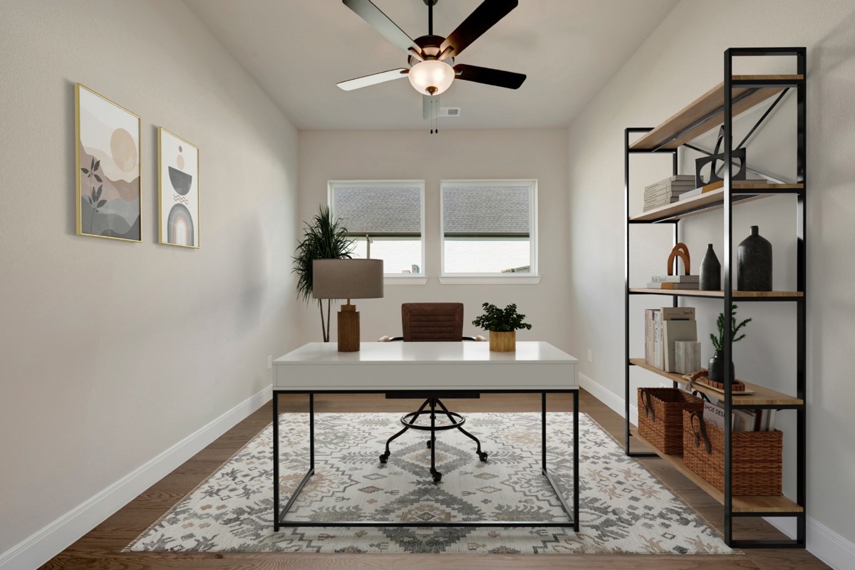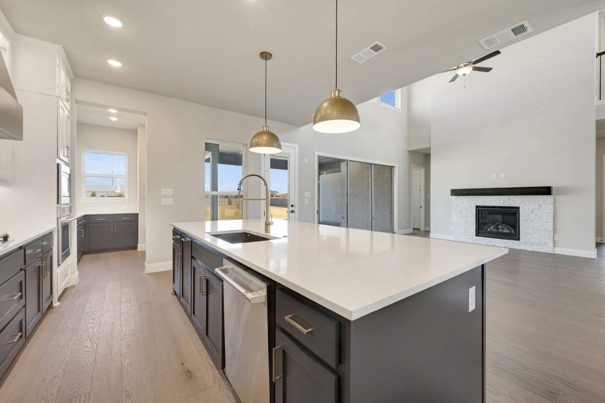 This exquisite five bedroom, four and a half bath home in Pecan Square offers an ideal blend of luxury, space, and functionality. Designed for both entertaining and everyday living, the home includes a spacious study and a dedicated media room that provide perfect spaces for work, relaxation, or movie nights. The open concept living areas are filled with natural light and flow seamlessly into the chef inspired kitchen, creating an inviting atmosphere for family and guests.