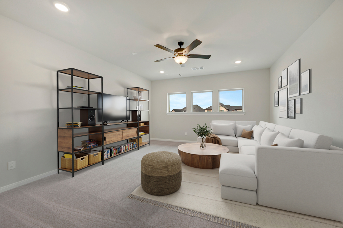 The Emmett by David Weekley Homes also features an upstairs retreat and media room that's perfect for the kids to have their playroom and/or entertain guests. The over sized 3 car garage is ideal for families with multiple drivers or just needing extra storage space.