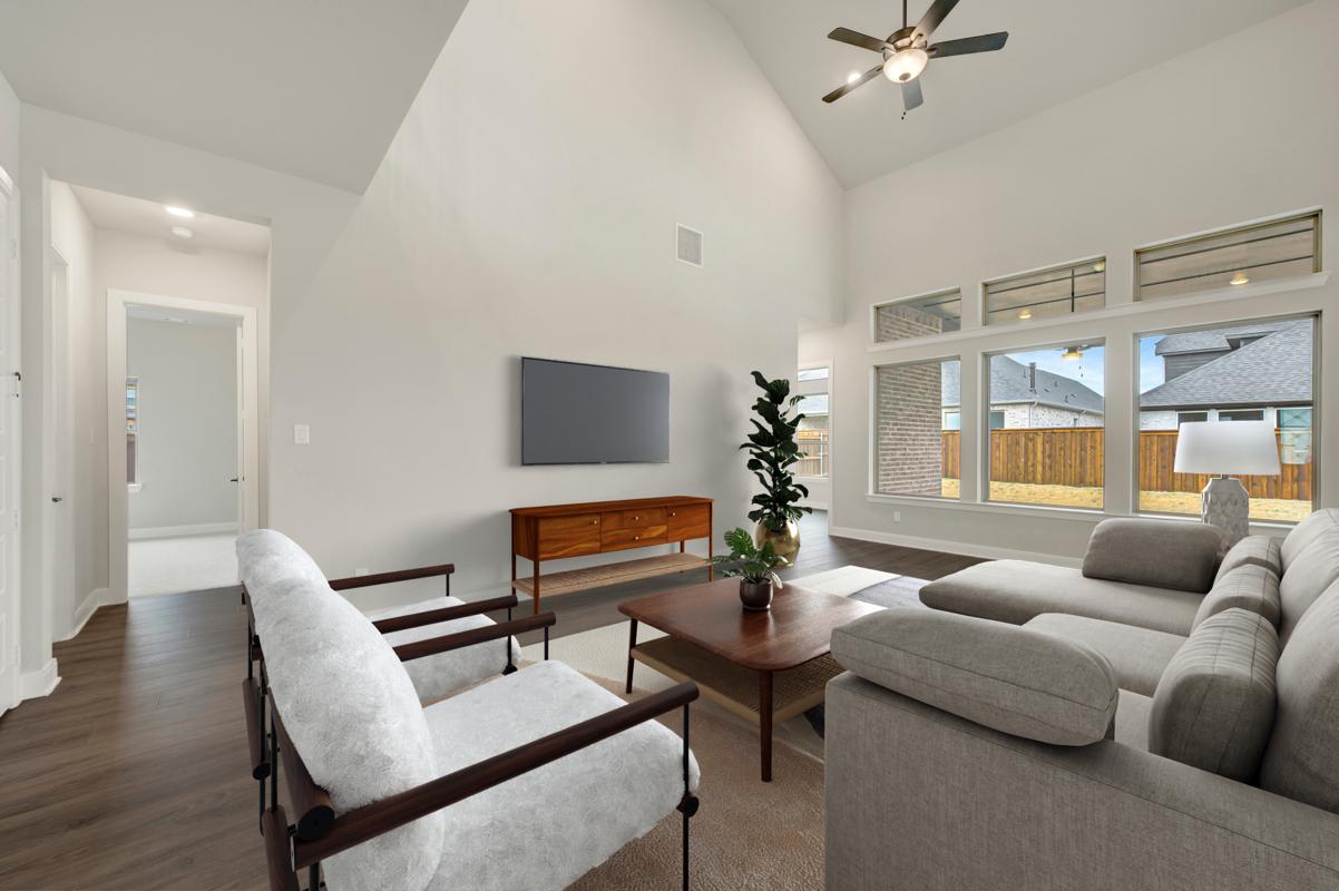 A porch graces the front of the home, adding to the glamorous view that extends throughout the home and all the way to the backyard. High ceilings in the family room and a 12’ ceiling in the Owner’s Retreat add to the architectural appeal of this amazing home.
