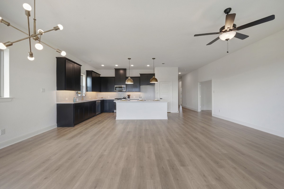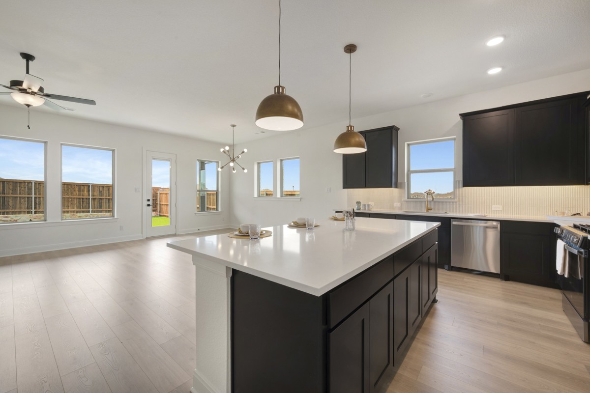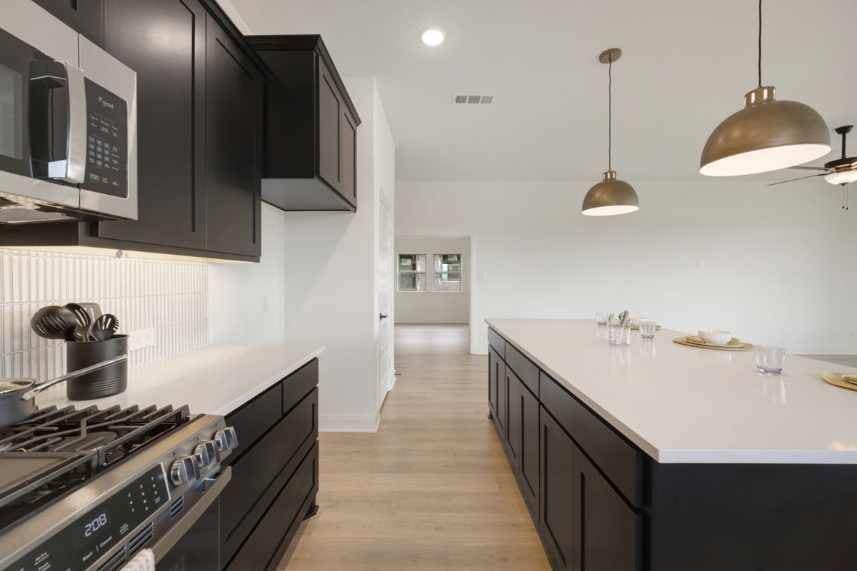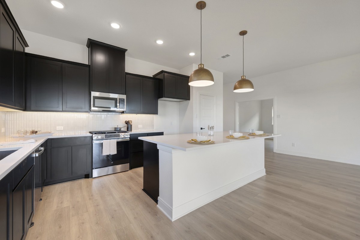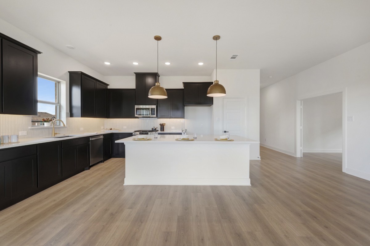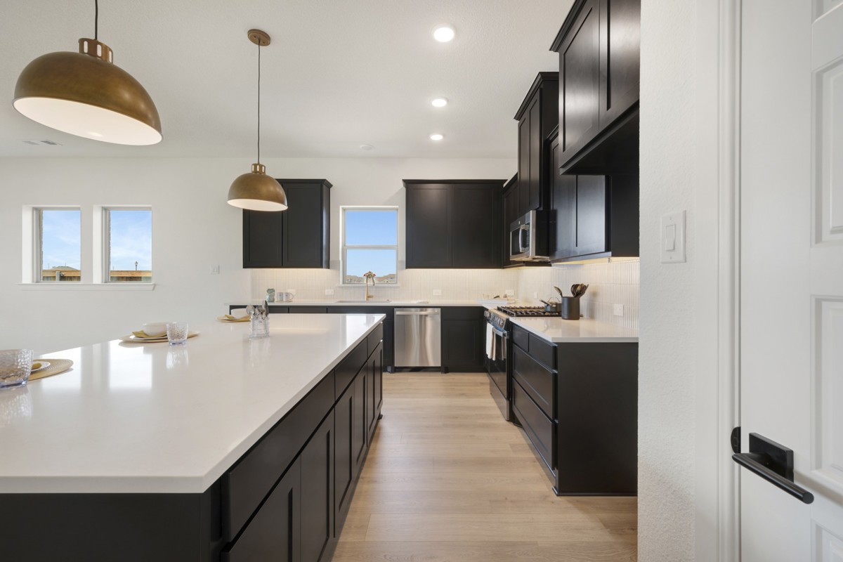 Step inside to discover a stunning interior featuring sleek black cabinetry, warm brass fixtures, and light quartz countertops that create a sophisticated contrast throughout the home. The chef-inspired kitchen boasts a matte black sink, elegant vertical tile backsplash, and statement pendant lighting, all seamlessly connected to an open family and dining area.
