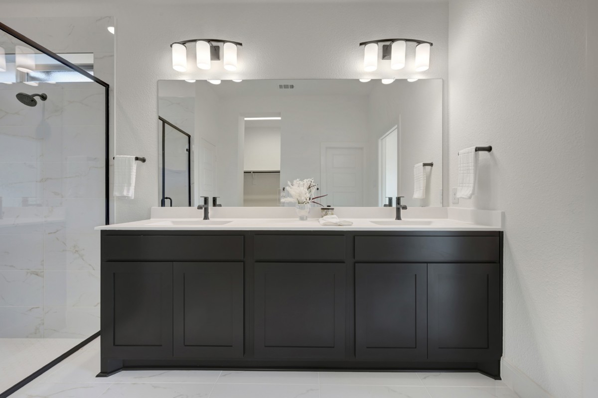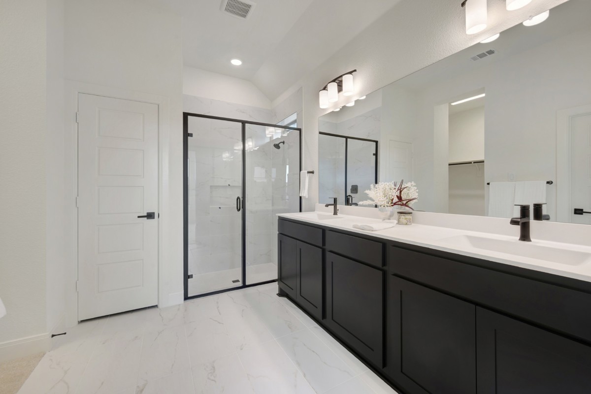 The owner’s retreat offers a serene escape with a spa-like bath showcasing marble-look tile, matte black fixtures, and modern lighting. Secondary baths continue the elevated design with coordinating finishes and stylish black cabinets.