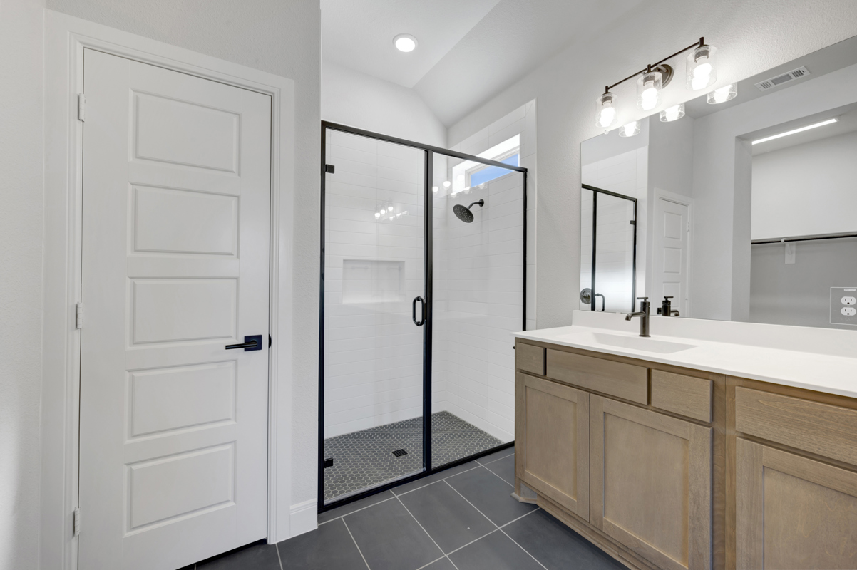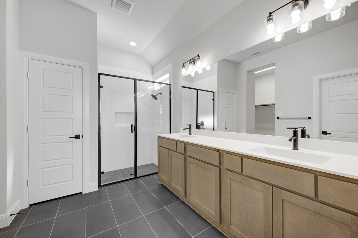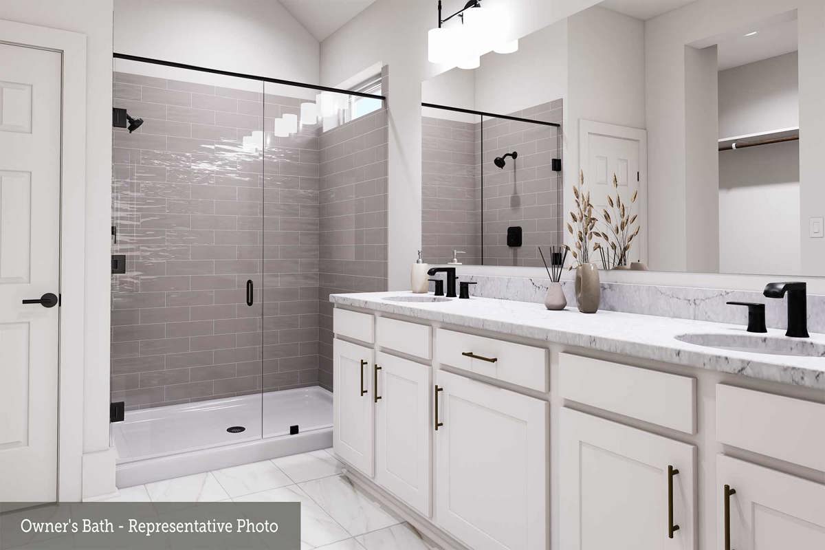 The owner’s bath becomes a true retreat, featuring natural wood tones, crisp white finishes, and bold black accents, while the secondary baths carry a cohesive, fresh design.