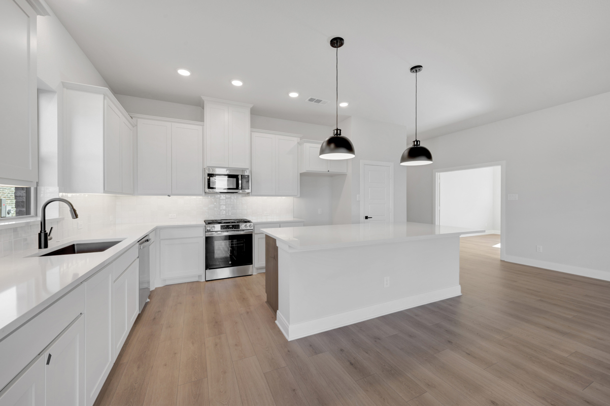 Inside, every detail is carefully chosen to create a modern yet timeless feel. The kitchen pairs clean white and warm wood cabinetry with quartz countertops, striking black fixtures, and designer pendant lighting.
