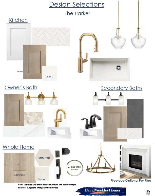 Inside, you’ll find a light and airy interior inspired by soft alabaster walls, warm natural wood tones, and sophisticated mixed-metal finishes. The kitchen serves as the heart of the home, featuring crisp white cabinetry complemented by a contrasting warm wood island, elegant quartz countertops, and a timeless herringbone backsplash. Statement pendant lighting with clear glass shades and a striking brass gooseneck faucet add warmth and character, creating a space that feels both refined and inviting. The open-concept layout flows seamlessly into the spacious dining and family areas, enhanced by durable laminate flooring that brings both beauty and practicality to everyday living.