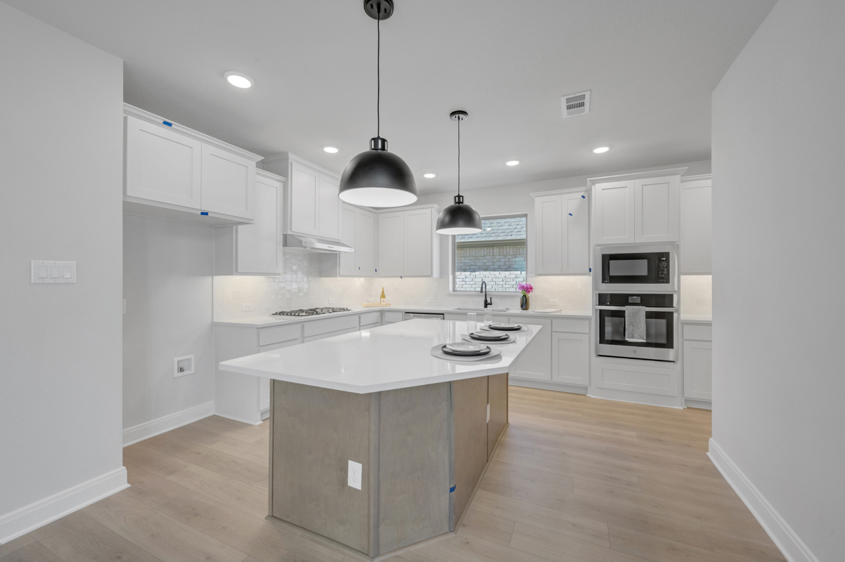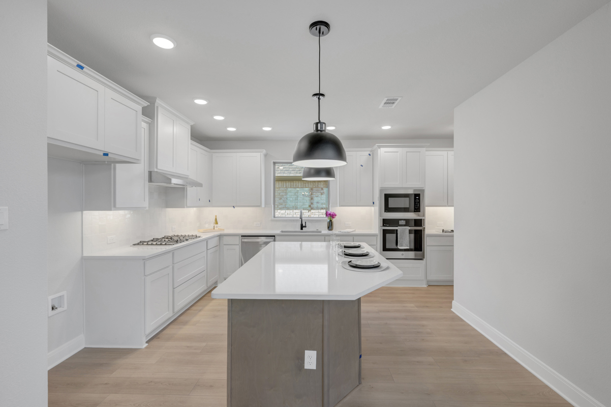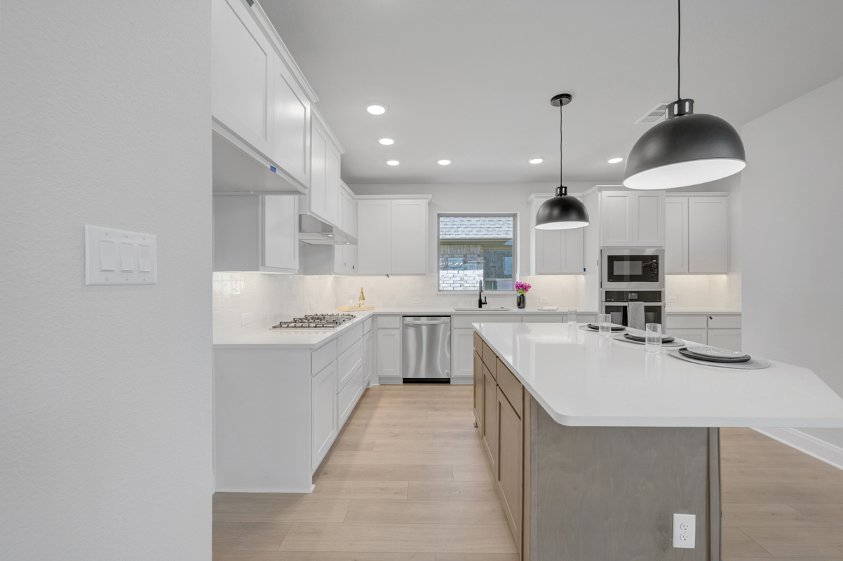 The upgraded kitchen is a chef’s dream, featuring a built-in gas cooktop, stacked oven and microwave, and elegant finishes throughout. The open-concept layout flows seamlessly into the extended covered porch, perfect for outdoor dining and entertaining.