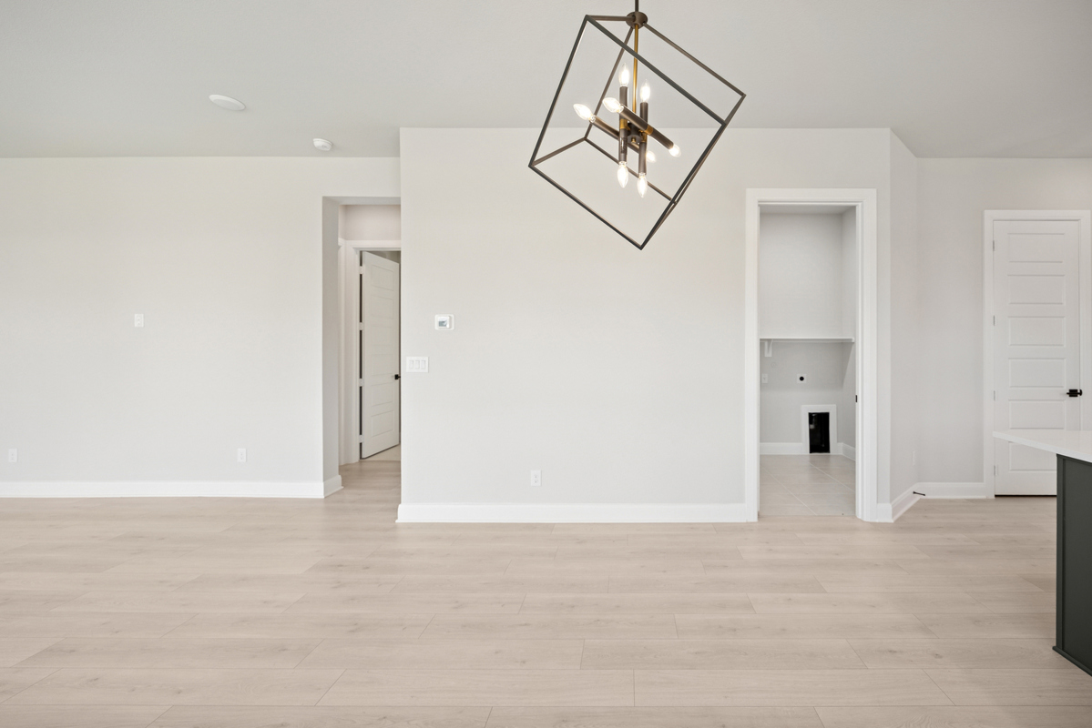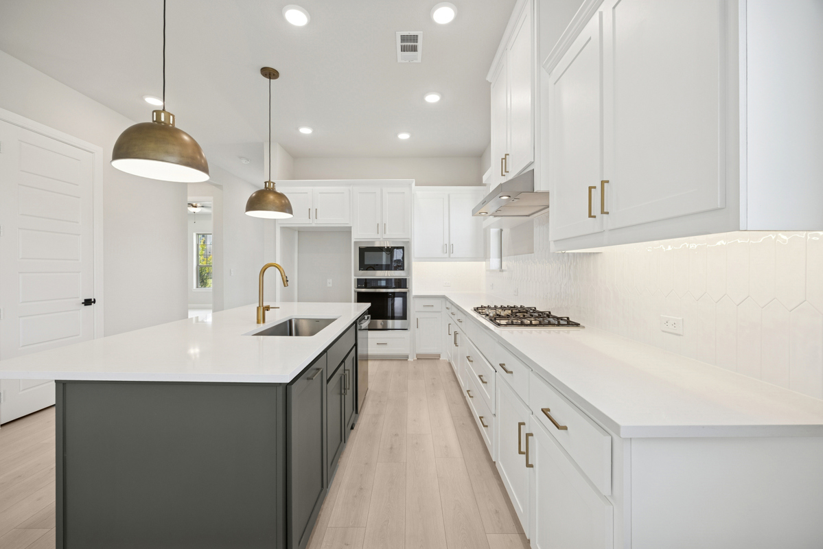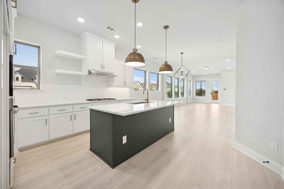 A tasteful kitchen rests at the heart of this home, balancing impressive style with easy function, all while maintaining an open design that flows throughout the open-concept dining and family gathering spaces. The covered porch adds a great place to relax in the shade.