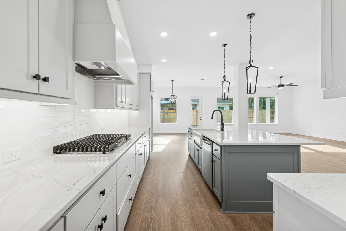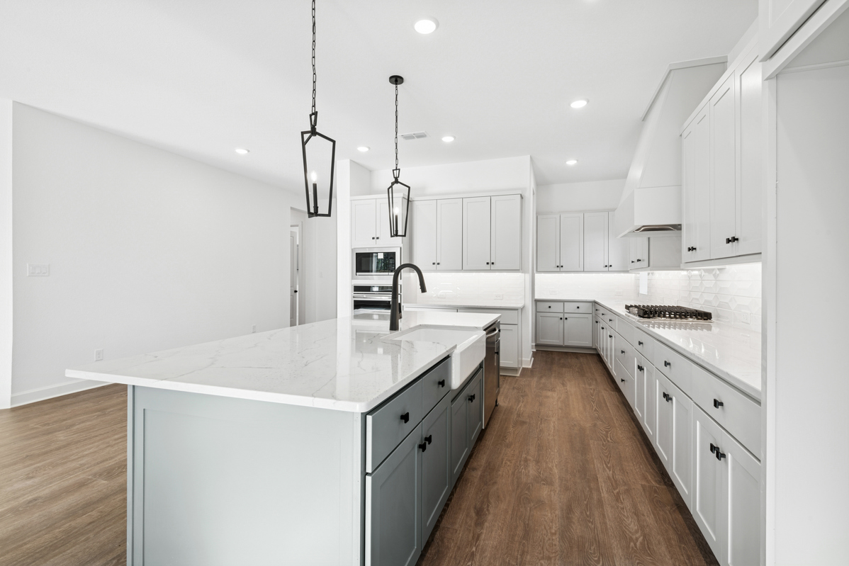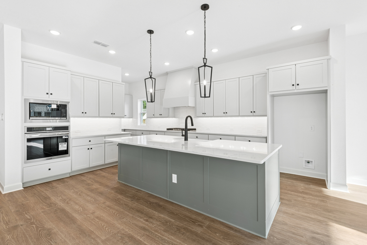 Step outside to the oversized back patio, the perfect space for summer cookouts and gatherings with friends and family. The chef’s kitchen is a true masterpiece, featuring elegant design elements such as a mounted oven, 36-inch vent hood, sleek quartz countertops, and a spacious walk-in pantry.