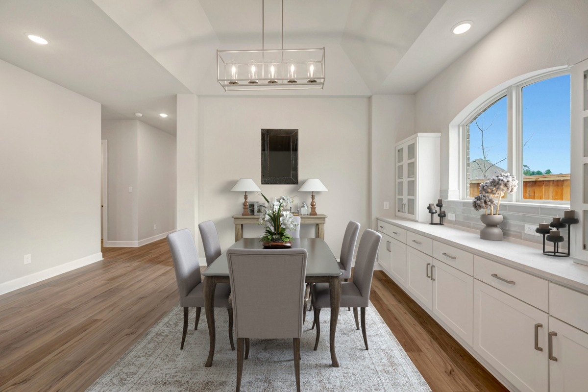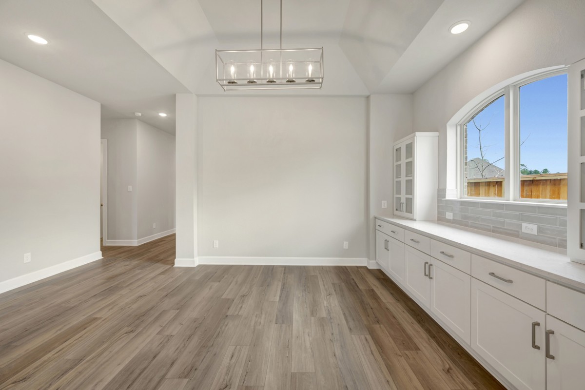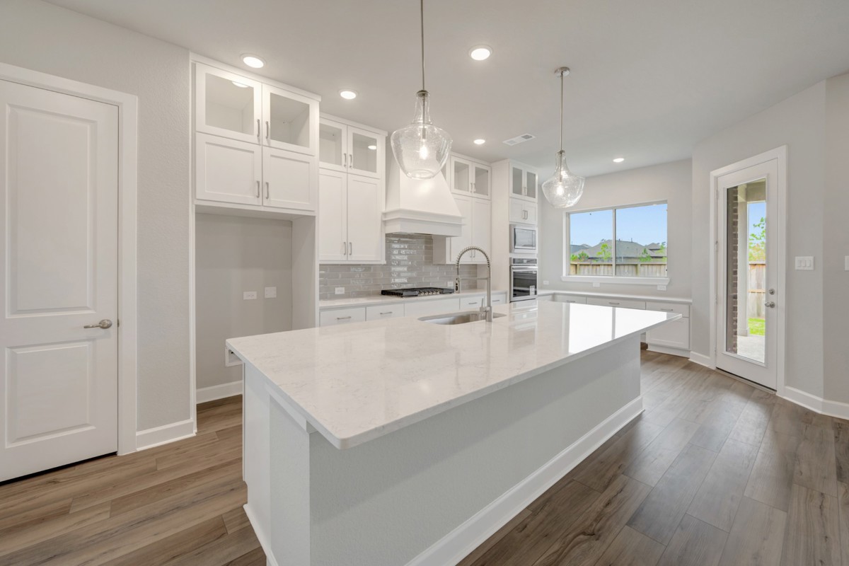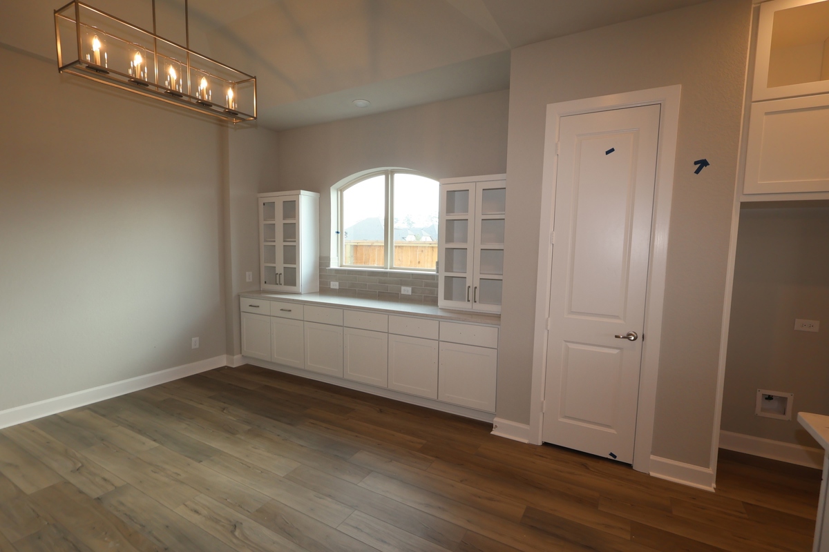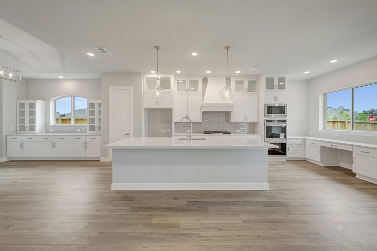 Step into a chef-inspired kitchen adorned with white cabinetry and extended cabinetry in the dining area to display cherished items. A premium appliance package includes double ovens and a built-in cooktop with a custom vent hood, making entertaining effortless. Built in command center where your chef inspired recipes can be found or a coffee bar. The possibilities are endless!