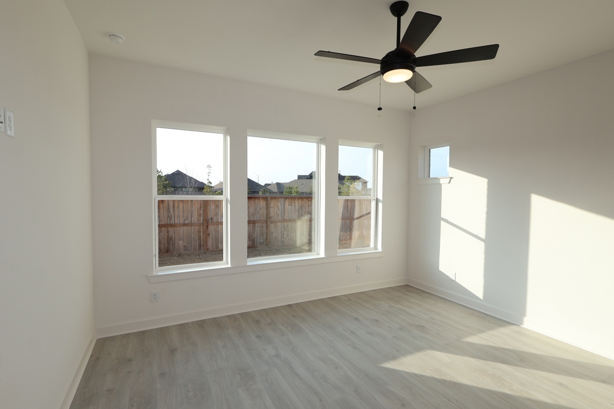 The owner’s retreat shines with large windows, a spa-inspired bath, and an oversized owner's closet that will thrill! The secondary bedrooms are a true Jack-and-Jill arrangement, plus an additional guest room for visitors. A generously sized open space connects the kitchen to the dining and family areas, making gatherings a breeze. Built-in cabinetry in the dining room pairs with custom kitchen cabinets to offer ample storage and display space. Upgrades abound, including wood-look flooring, upgraded Frigidaire appliances, and a chef’s dream oversized island.