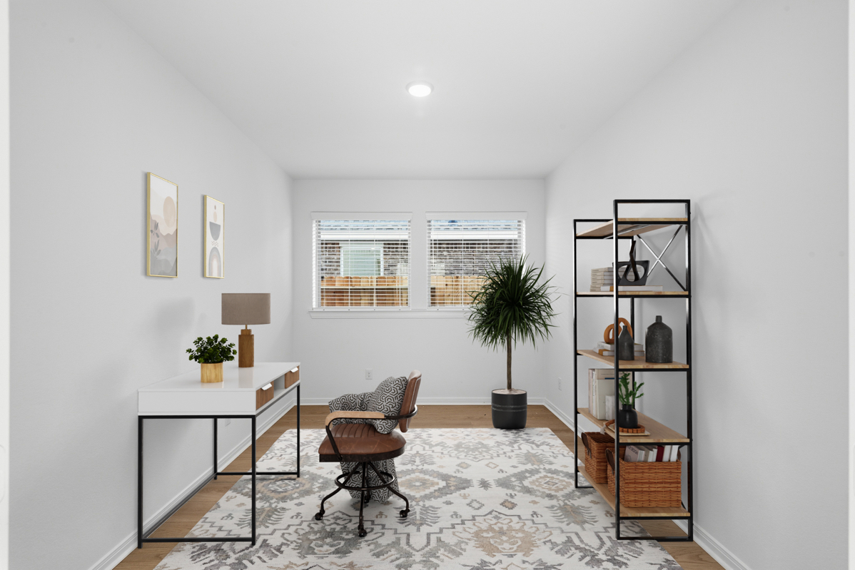 The Harperville by David Weekley Homes blends comfort and luxury to create a home designed for modern living. At the front of the home, a closed study with elegant French doors offers the ideal space for a home office or social lounge, combining style with privacy.