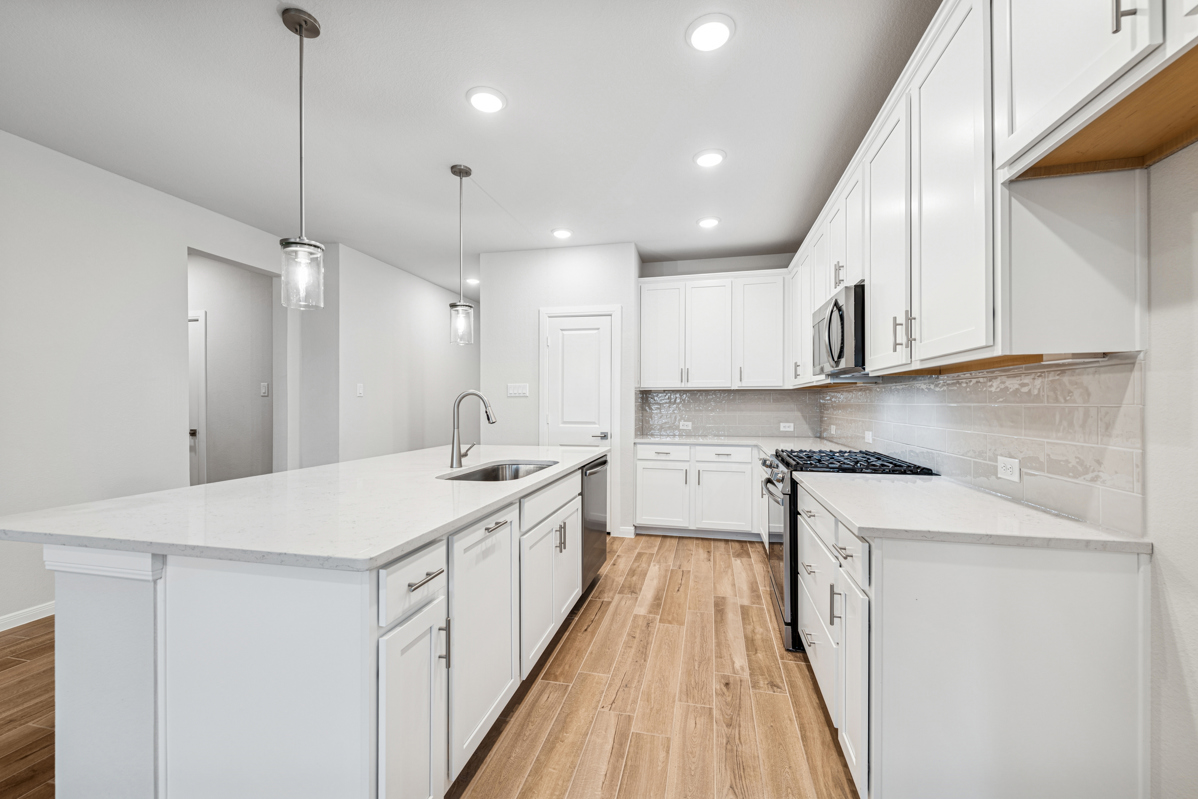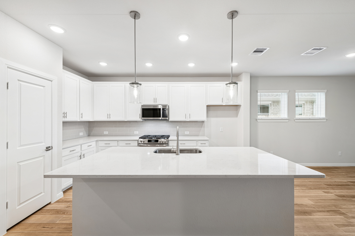At the heart of the home, the beautifully appointed kitchen features white cabinetry, Cosentino Lyra quartz countertops, and a generous walk-in pantry, creating a clean and timeless space to gather, cook, and connect. A large, full-function island seamlessly anchors the open-concept family and dining area—ideal for entertaining and making memories.
