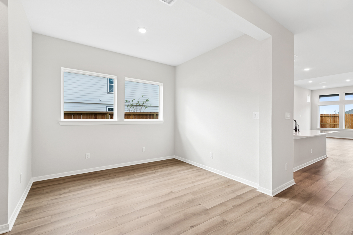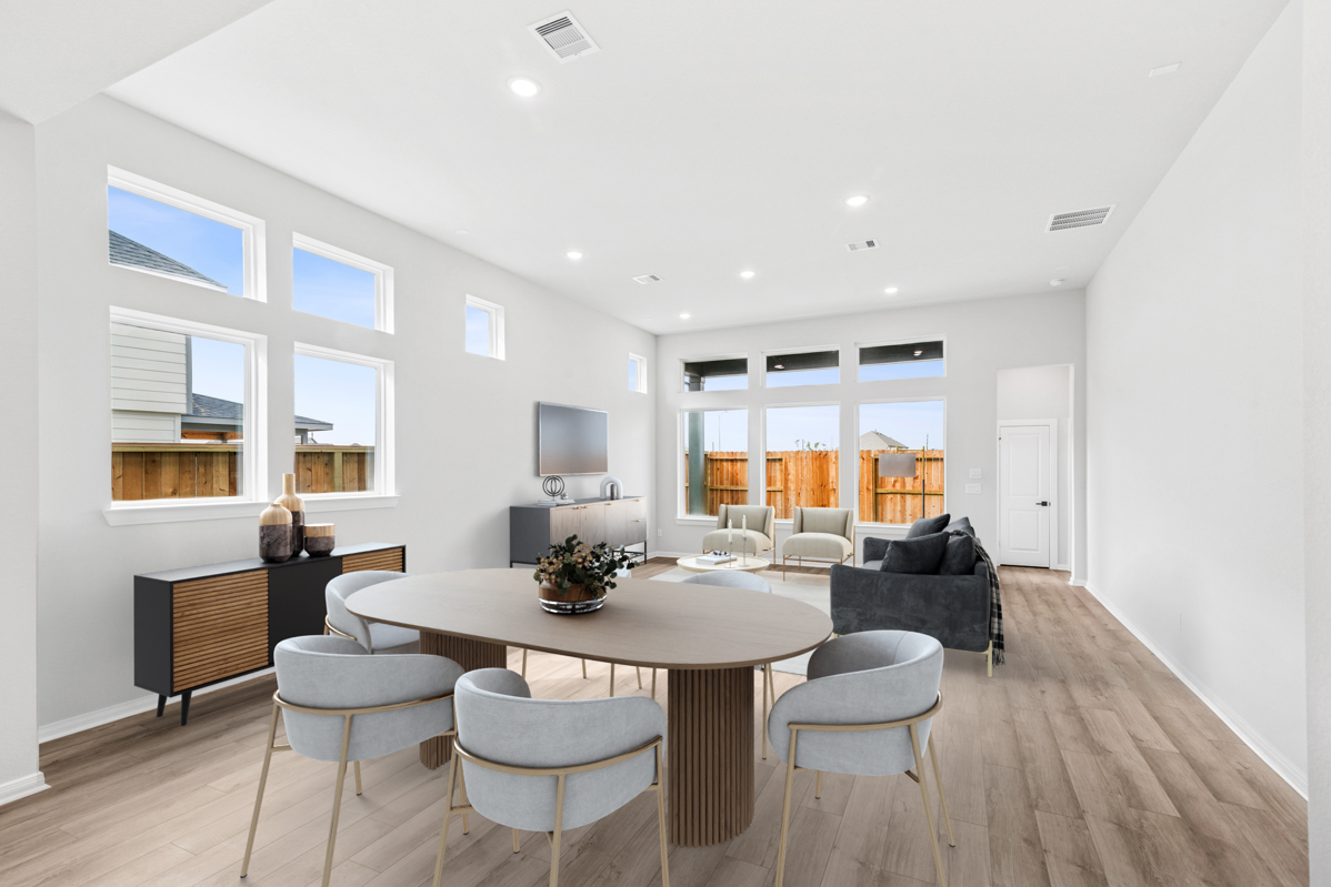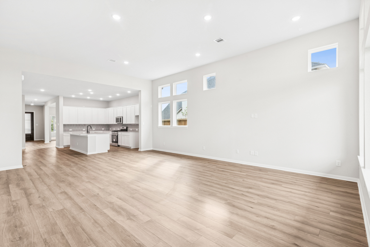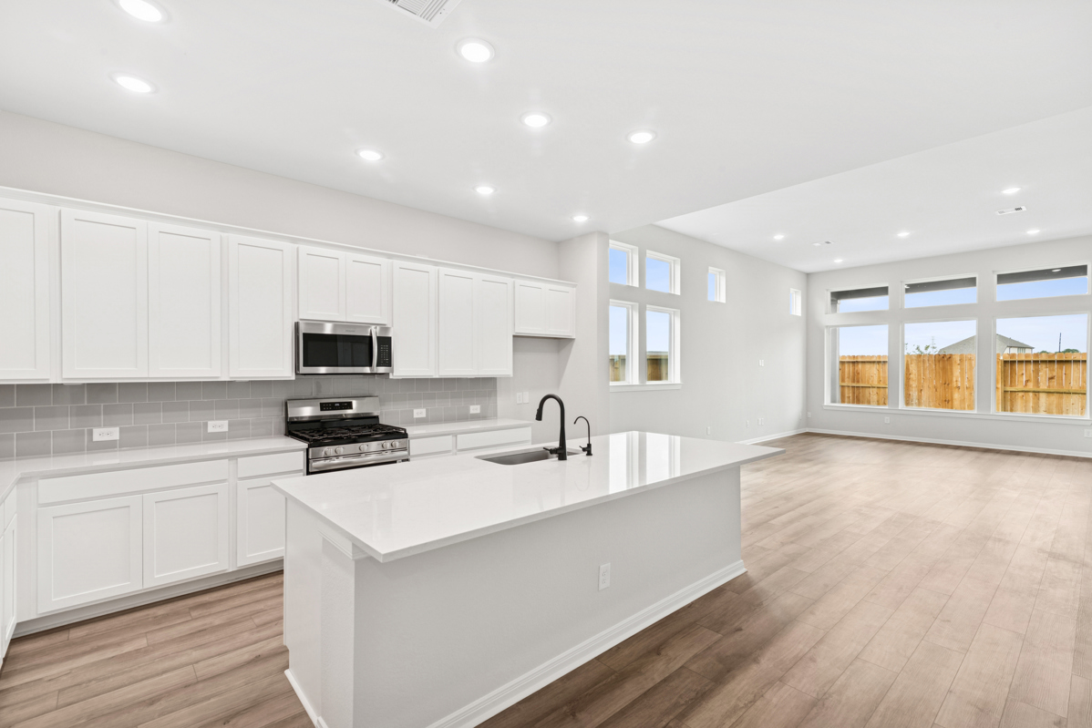 WALLS OF WINDOWS brighten the open-concept family, kitchen, and dining areas. The gourmet kitchen features abundant cabinetry, quartz countertops, and an impressive 9-foot island that creates a beautiful focal point and seamlessly connects the main living spaces, perfect for entertaining or everyday living. Luxury vinyl flooring extends through the main areas for a clean, elevated look.