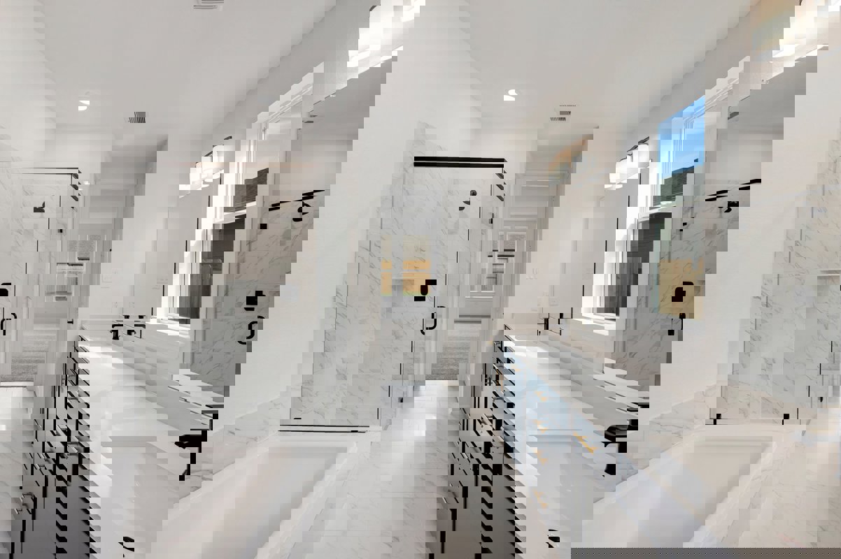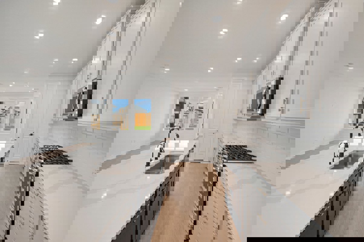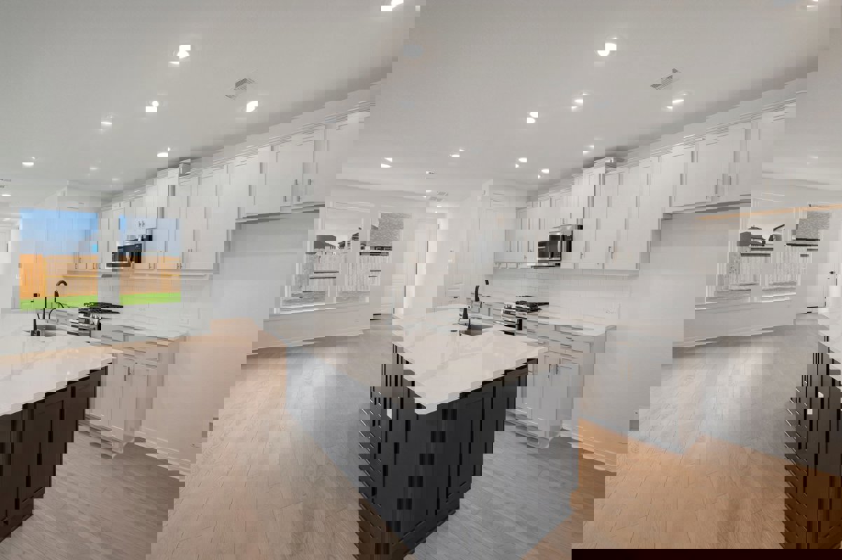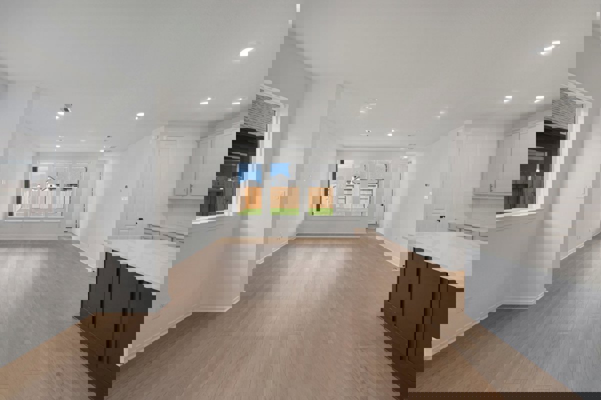 The open concept kitchen showcases white and navy cabinetry, quartz countertops, upgraded appliances, and an impressive 8 foot island wrapped in decorative panels for a designer finish. A bright study sits at the front of the home, ideal for working from home or a quiet flex space. The first floor Owner’s Retreat includes an oversized bedroom and a spa inspired bath with a separate tub and shower plus a double vanity sink.