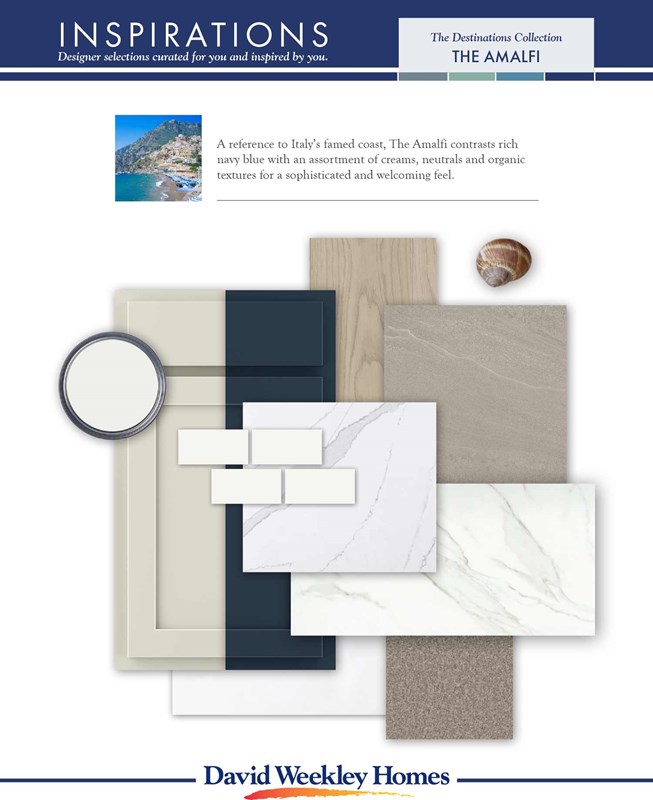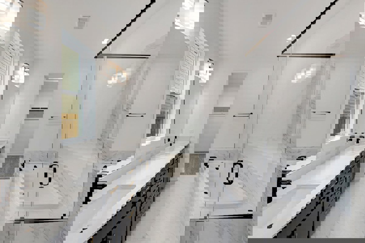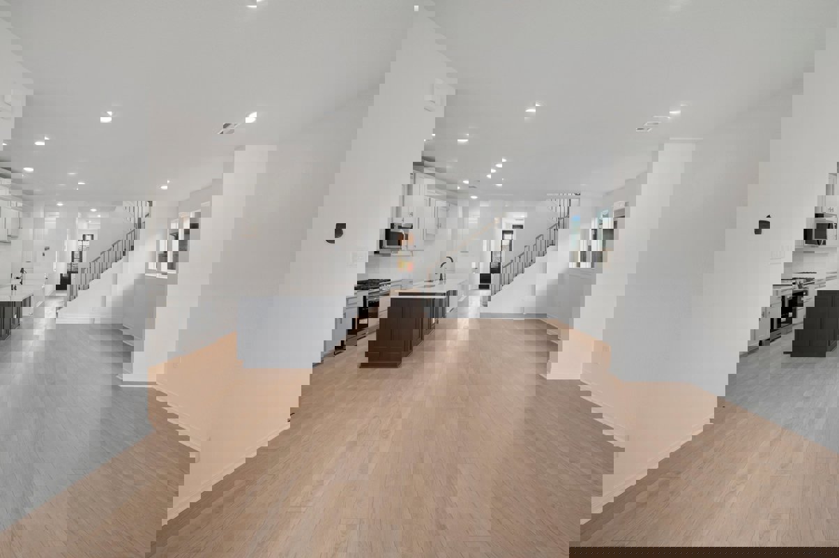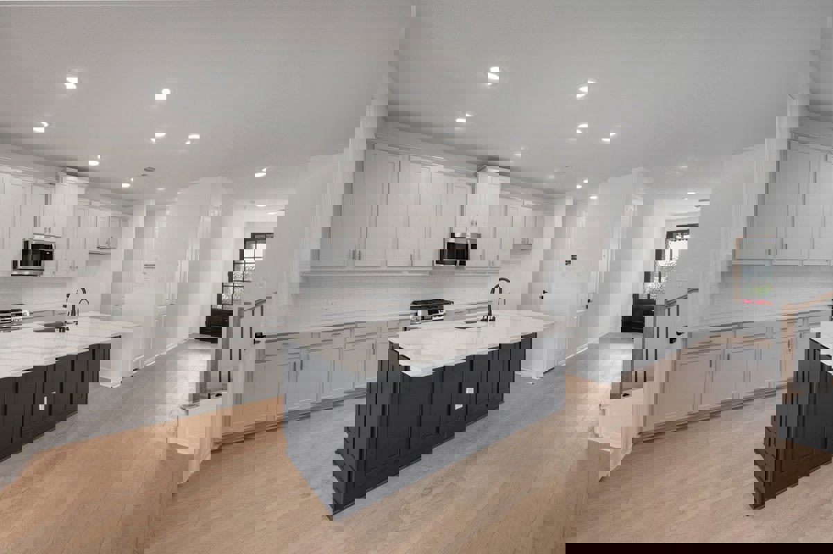 The open concept kitchen showcases white and navy cabinetry, quartz countertops, upgraded appliances, and an impressive 8 foot island wrapped in decorative panels for a designer finish. A bright study sits at the front of the home, ideal for working from home or a quiet flex space. The first floor Owner’s Retreat includes an oversized bedroom and a spa inspired bath with a separate tub and shower plus a double vanity sink.