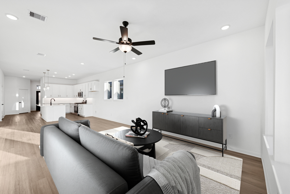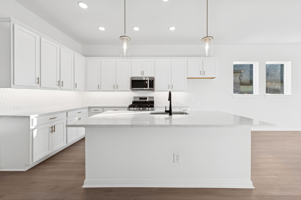 The open-concept living space is bright and inviting, anchored by a designer kitchen with quartz countertops, premium finishes, and a central island that is perfect for entertaining. The expansive Owner's Retreat offers ample room for a sitting area, a spa-inspired Owner's Bath, and a walk-in closet that checks every box. A covered patio extends your living space outdoors, ideal for morning coffee or al fresco dining.