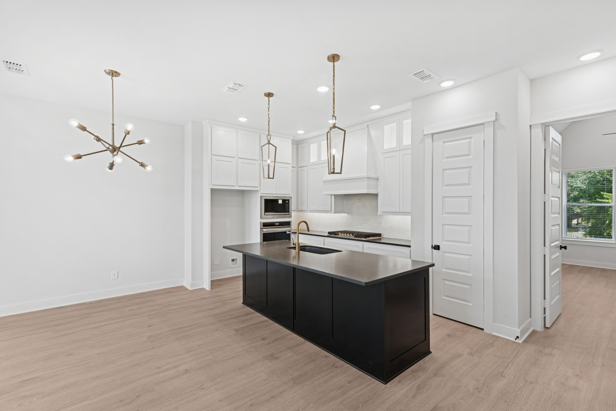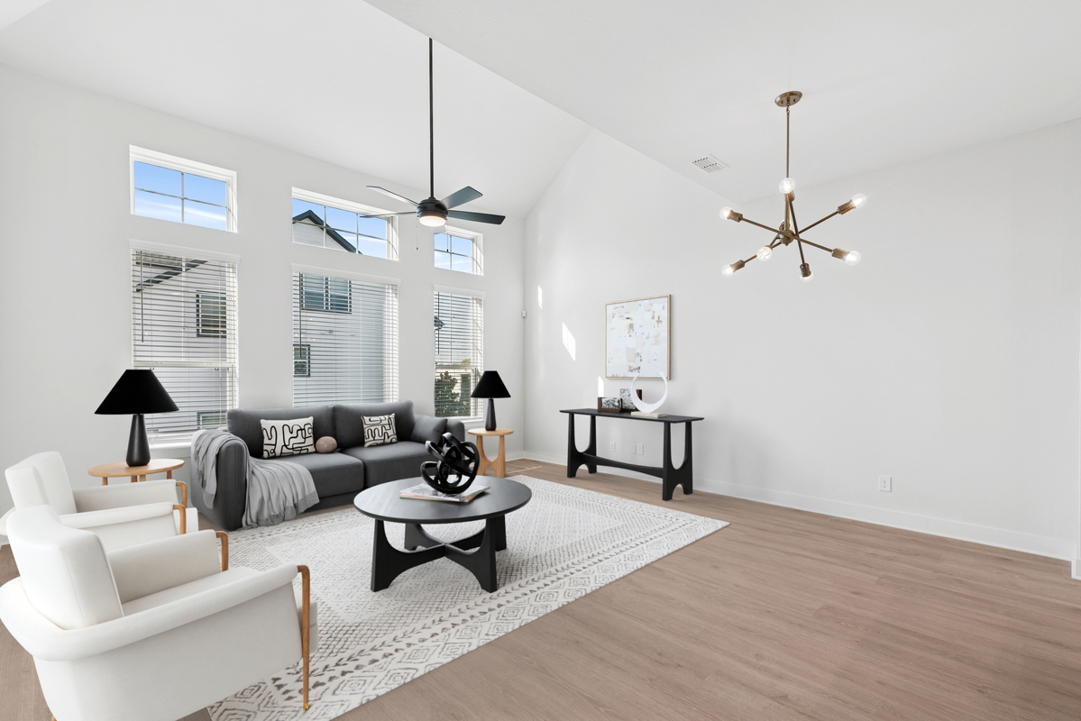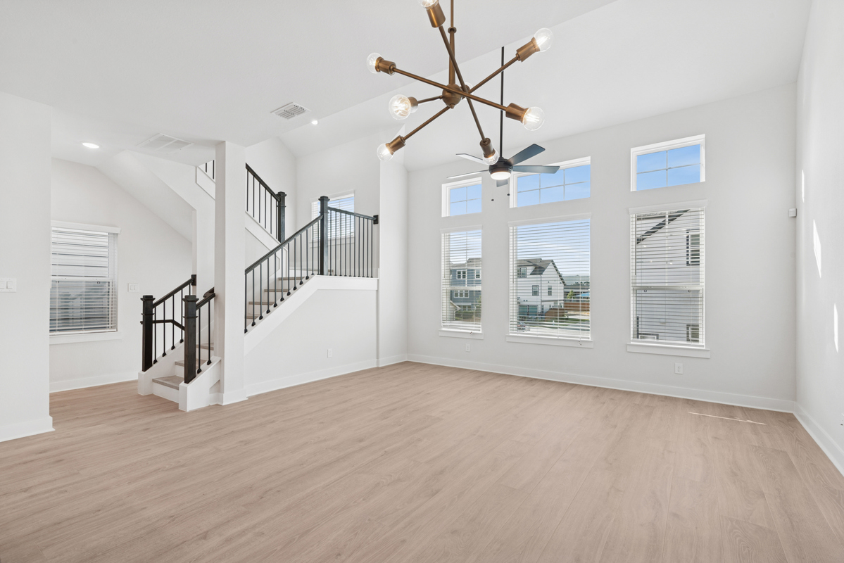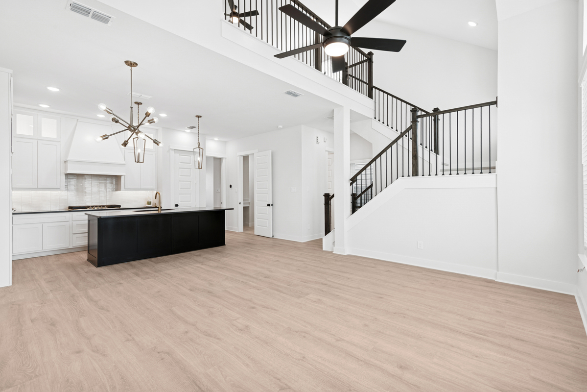 The second floor living room has a wall of windows that make the space light and bright with soaring ceilings. The open-concept plan has a kitchen that opens to the family room, perfect for entertaining with the large center island.