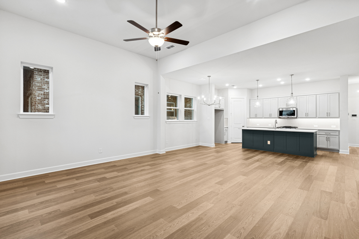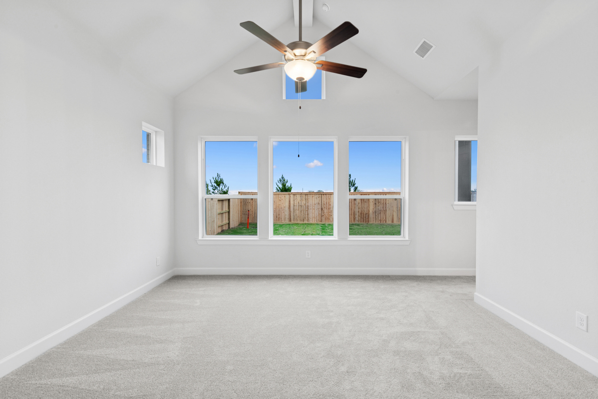 The Owner's Retreat impresses with a soaring cathedral ceiling, spa-inspired Owner's Bath with separate tub and shower, and a large walk-in closet. The kitchen, complete with a spacious island and walk-in pantry, flows seamlessly into the dining and family rooms. In the family room, 12-foot ceilings create a bright and welcoming space for gatherings.