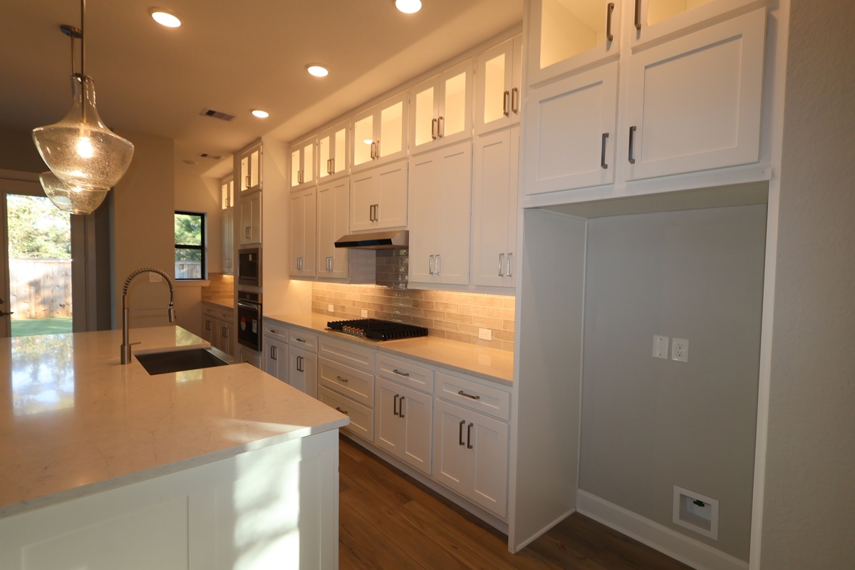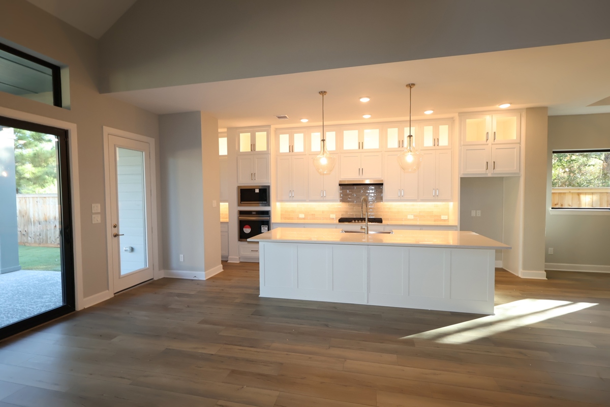 From the moment you enter, tall ceilings and an abundance of large windows fill the home with natural light, creating a bright and airy atmosphere. The functional and stylish kitchen is a standout, with a ten-foot island, stainless steel appliances, cabinetry extending to the ceiling with glass inserts and a coveted walk-in pantry measuring six by seven feet.