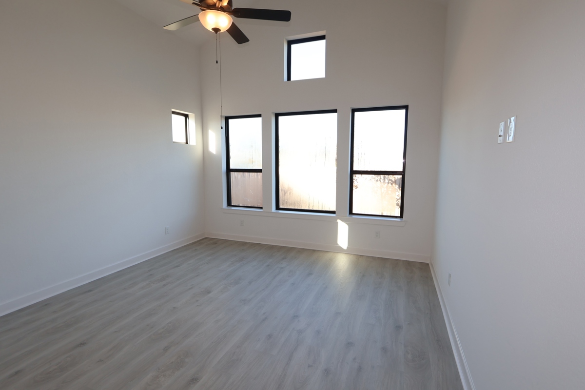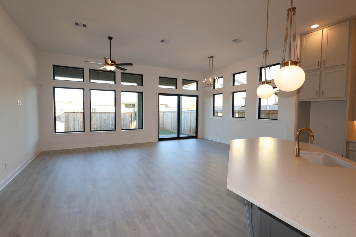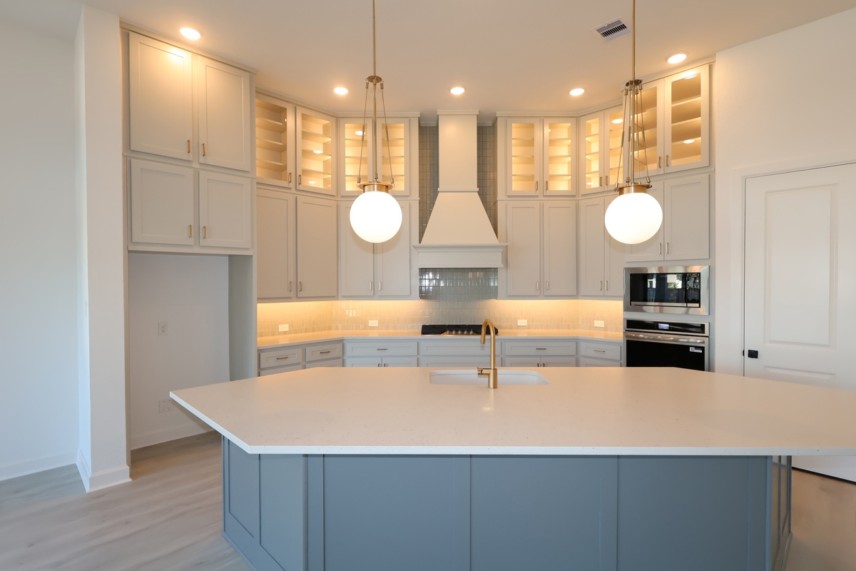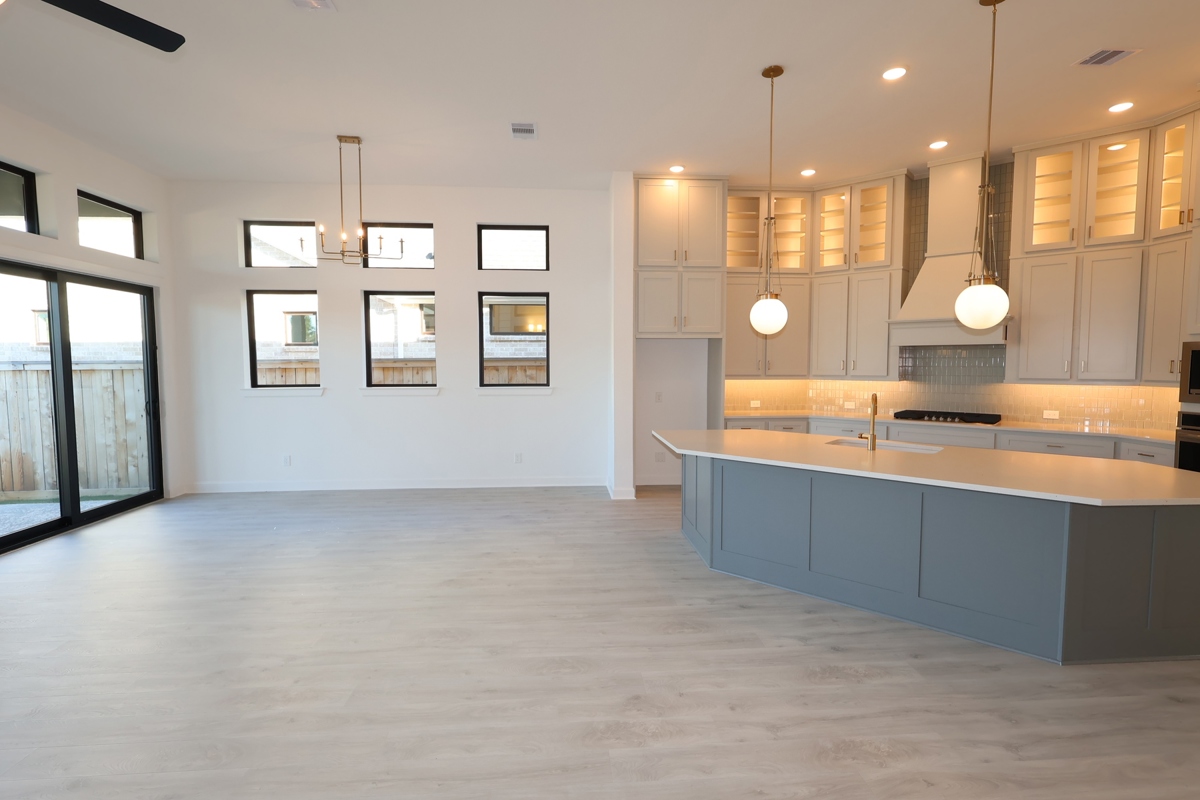 The chef’s kitchen includes cabinets to the ceiling for ample storage, stainless steel appliances, a huge island and quartz countertops that offer generous prep space. Adjacent to the kitchen, the family room boasts 12-foot ceilings and walls of windows that create a bright and inviting space ideal for hosting.
