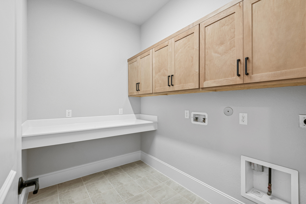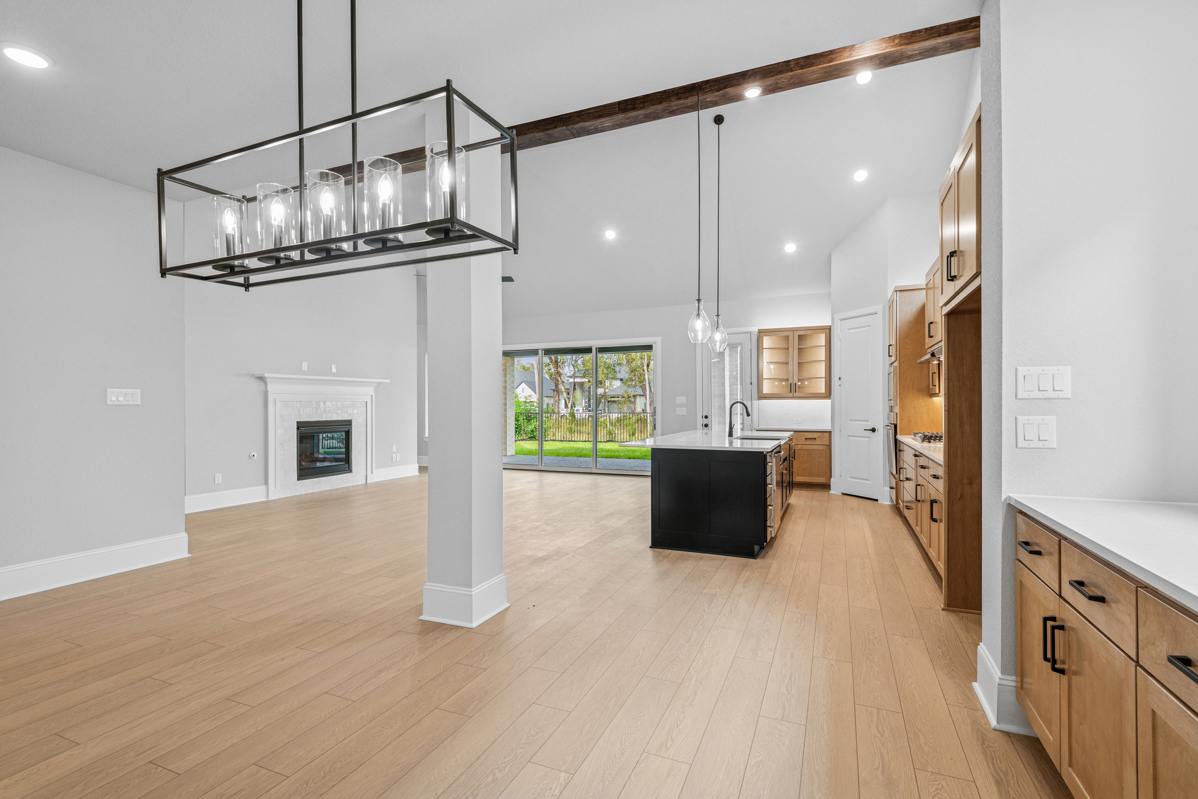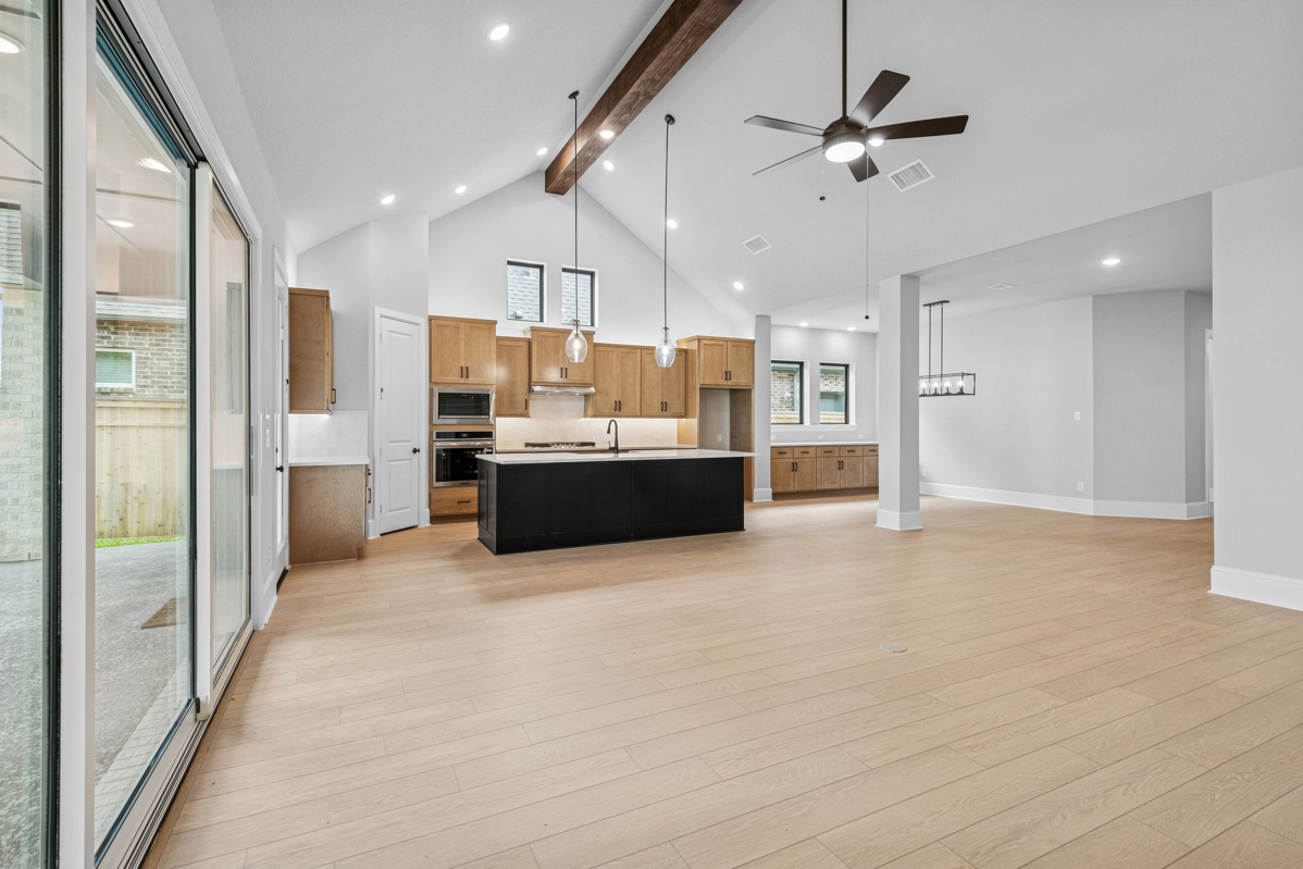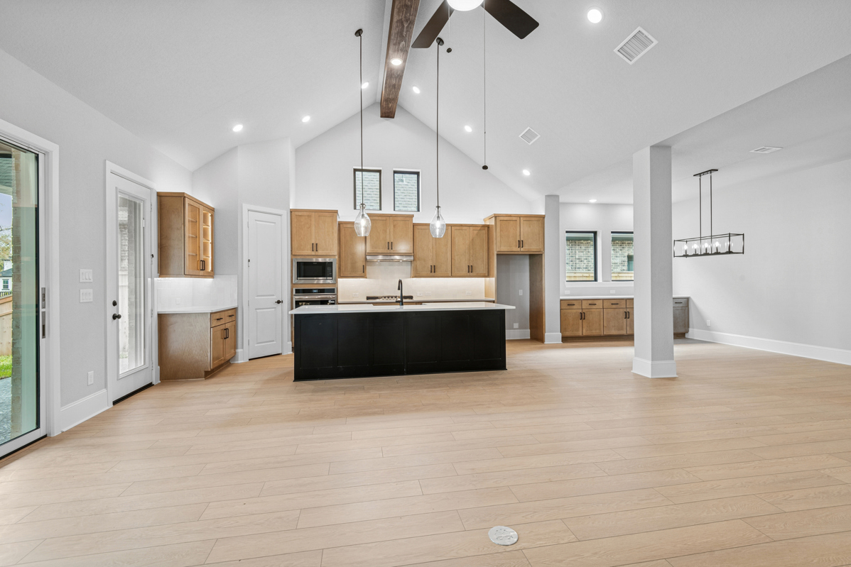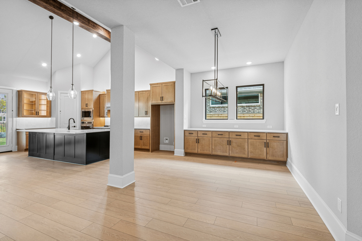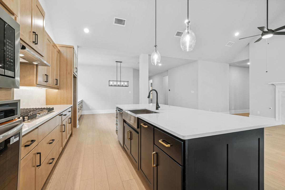 At the heart of the home, the gourmet kitchen shines with designer-selected Summer Wheat and Midnight Mystic cabinets, paired with Miami Oro quartz countertops and a stylish backsplash. A large presentation island opens to the dining and family room, creating an ideal space for entertaining. Shaw Oceanfront luxury vinyl plank flooring flows throughout the main living areas, adding warmth and durability with a sophisticated finish.