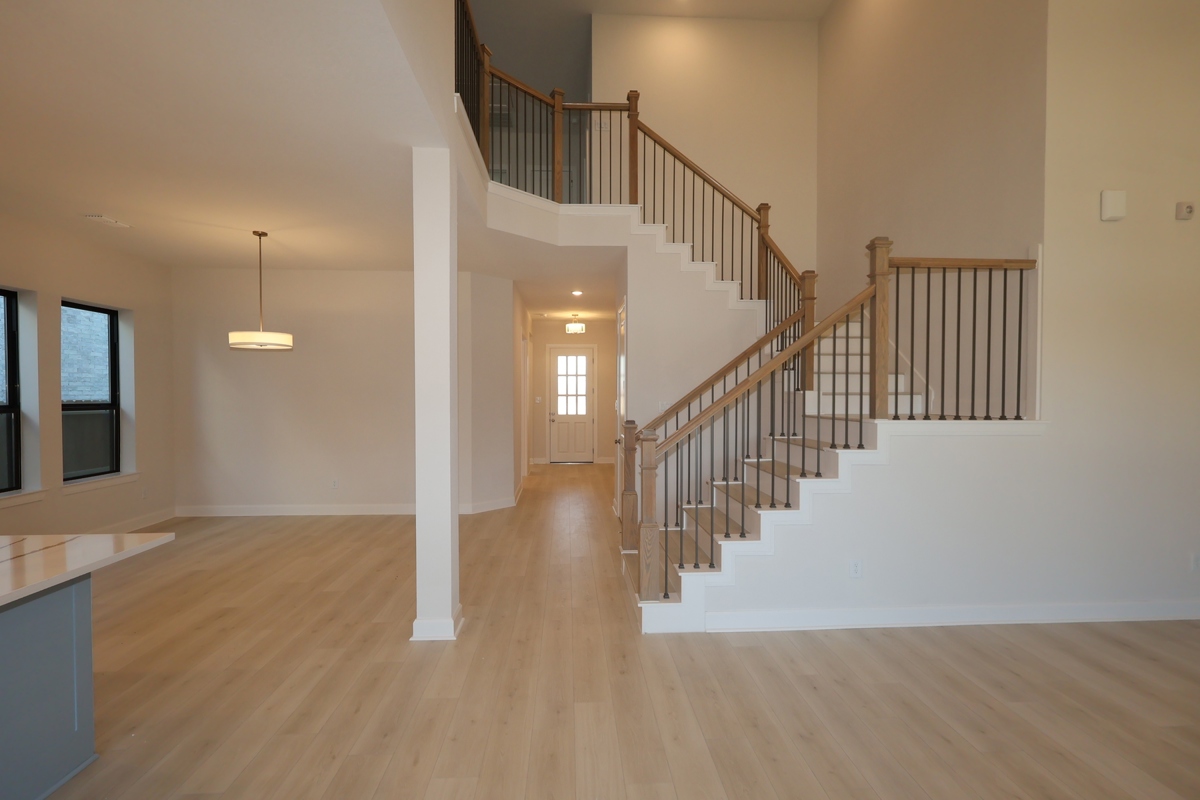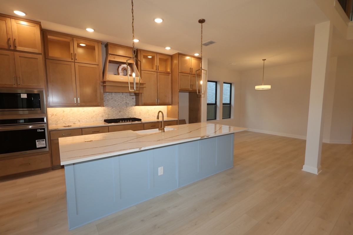 The contemporary kitchen features an oversized corner pantry, a large island, and open views to the main living spaces. Expansive windows and soaring ceilings fill the family room with natural light, creating a bright and inviting atmosphere in this beautiful home in Riceland.