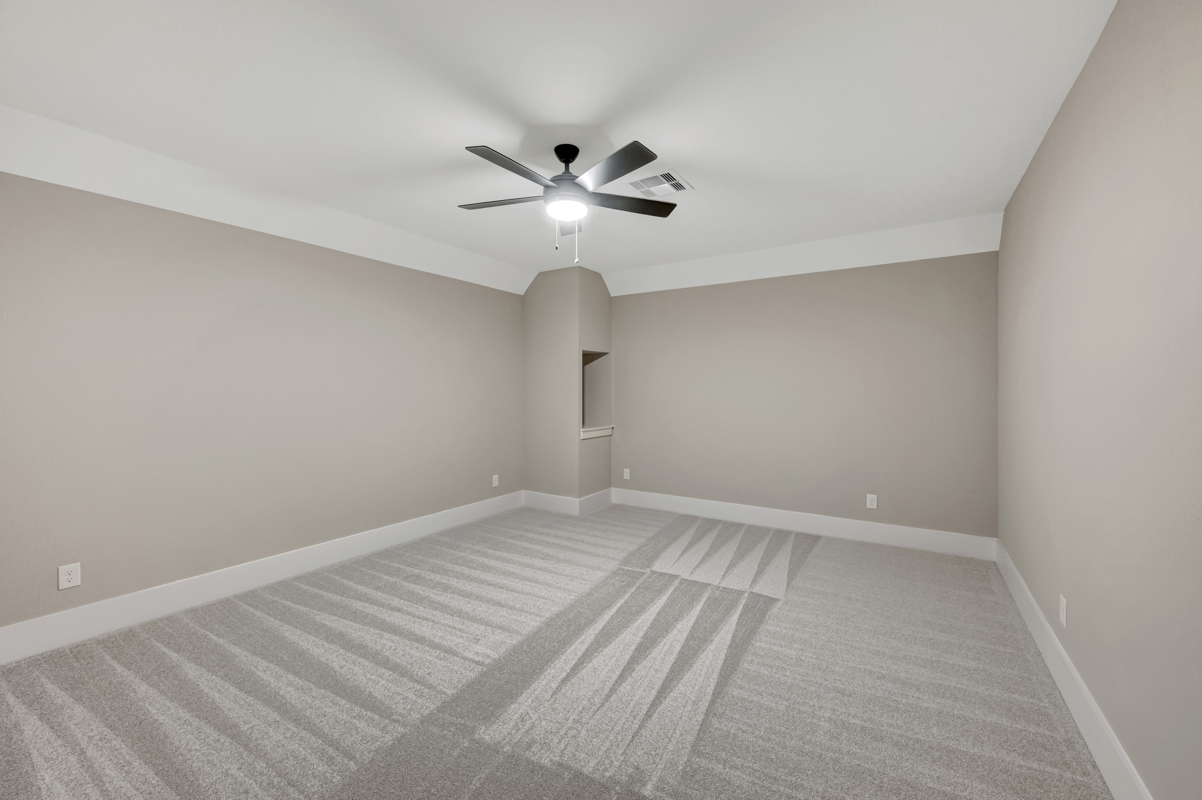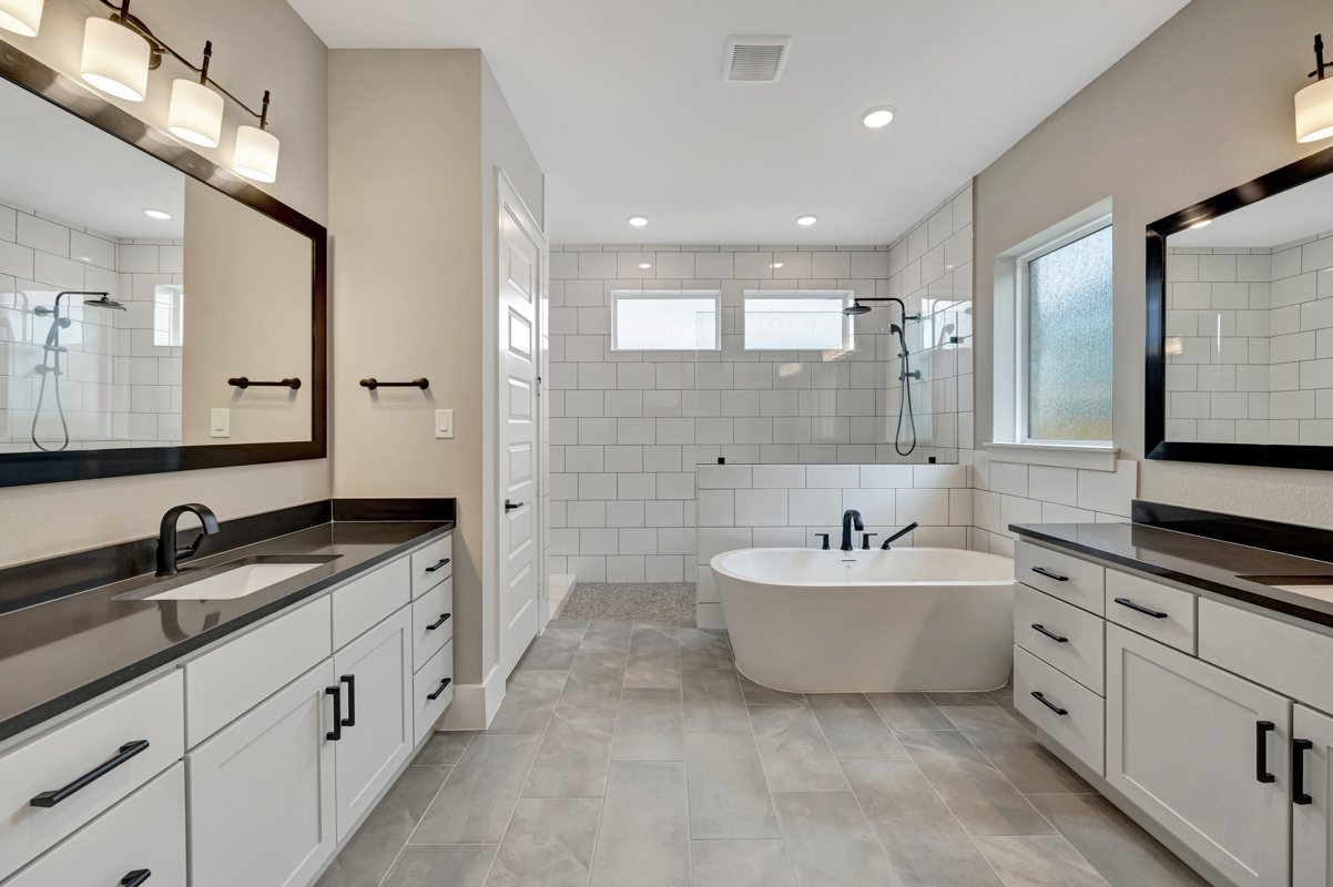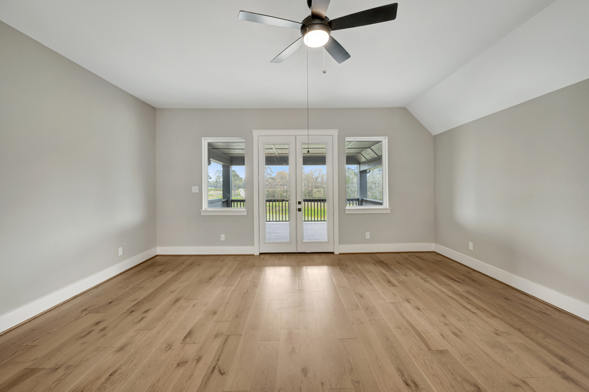 The private owner’s retreat showcases a cathedral beamed ceiling and direct access to a luxurious primary bath with dual vanities, an oversized super shower, and a soaking tub. The spacious walk-in closet offers direct access to the laundry room for added convenience.