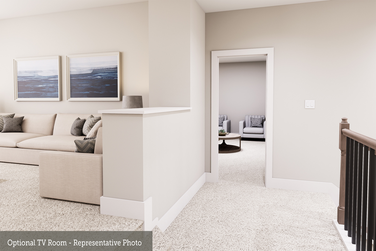 Upstairs includes a retreat area with access to a covered balcony overlooking a tranquil water feature with no rear neighbors, along with a media room and three additional bedrooms. A secondary bedroom downstairs with an en suite bath provides privacy for guests or multigenerational living.