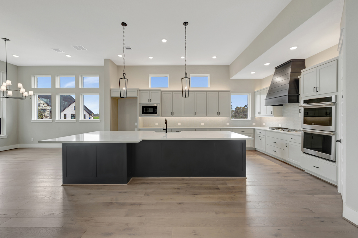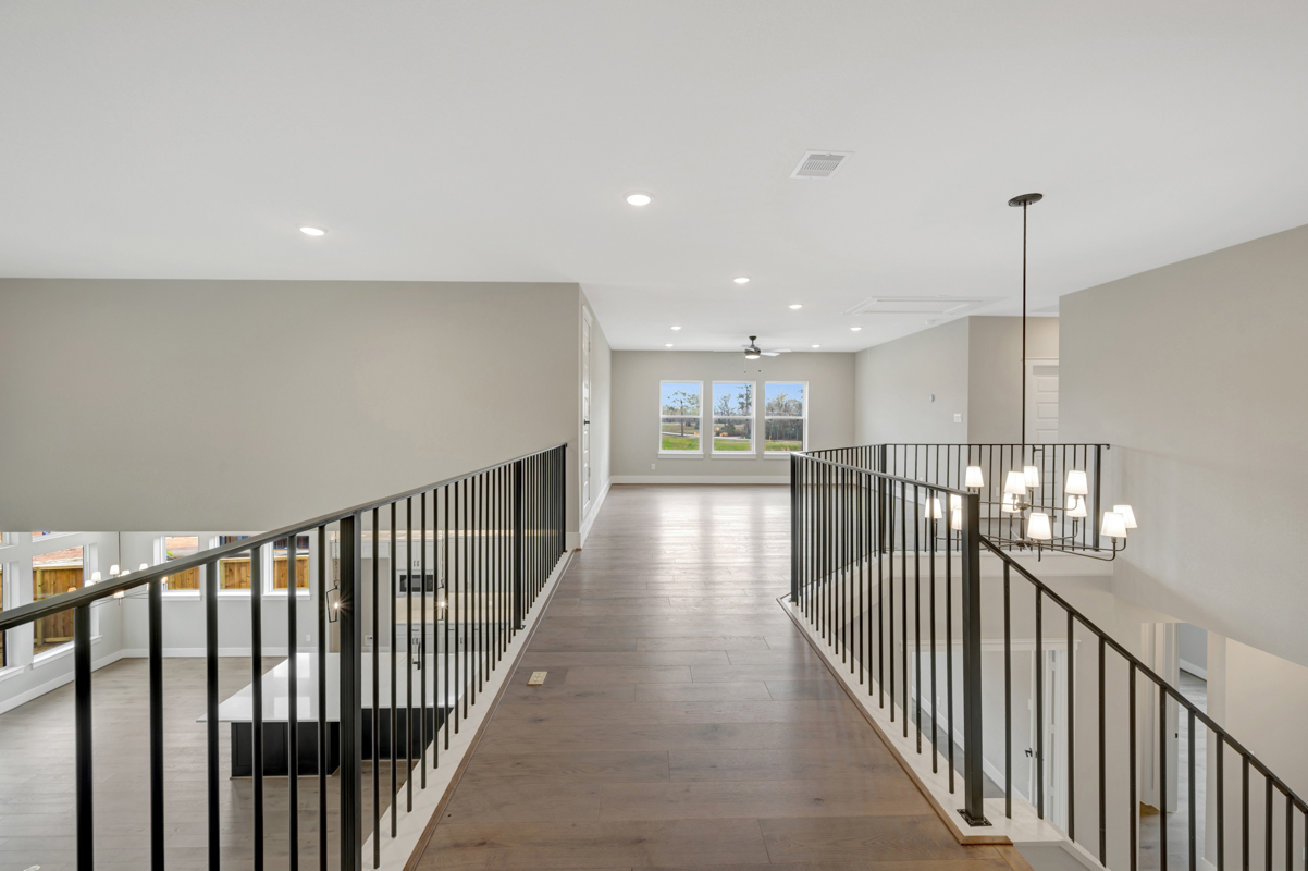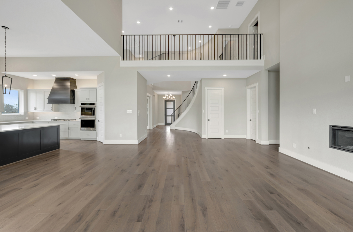 The grand entry features a curved staircase leading to a two-story catwalk, setting the tone for the vibrant open-concept design. The spacious kitchen includes an island that seats six to eight people and opens seamlessly to the dining and family rooms, creating the perfect space for family gatherings and entertaining.