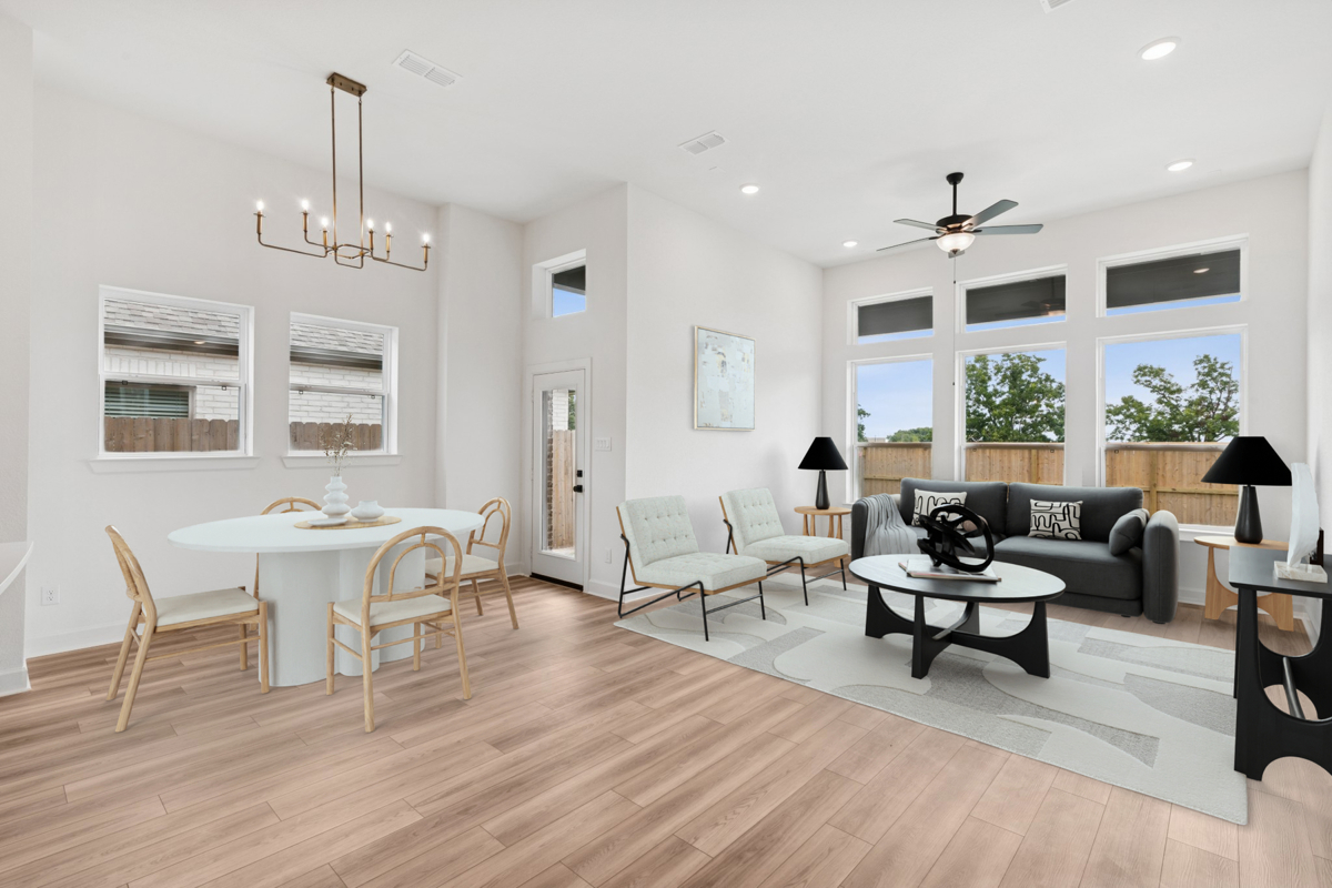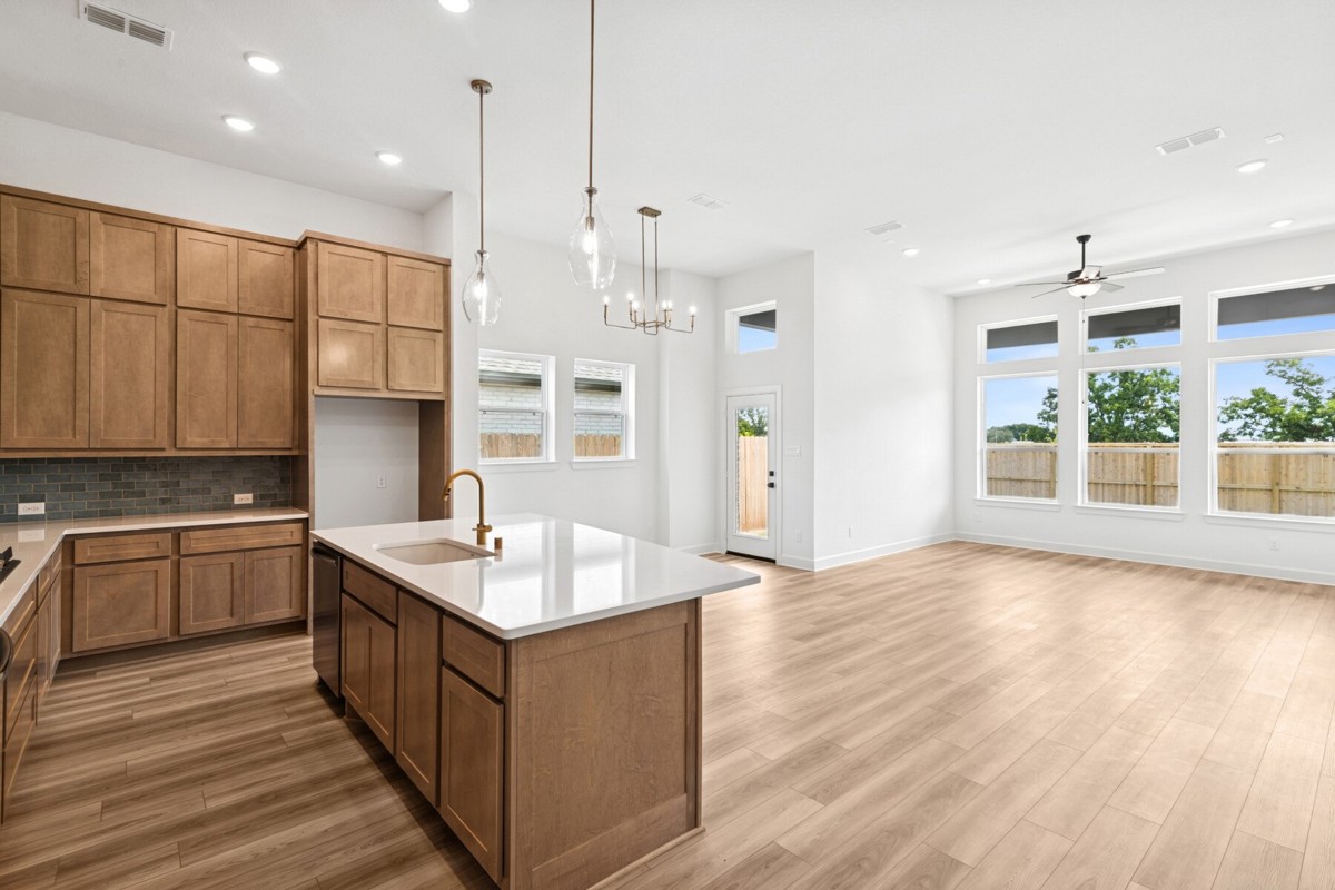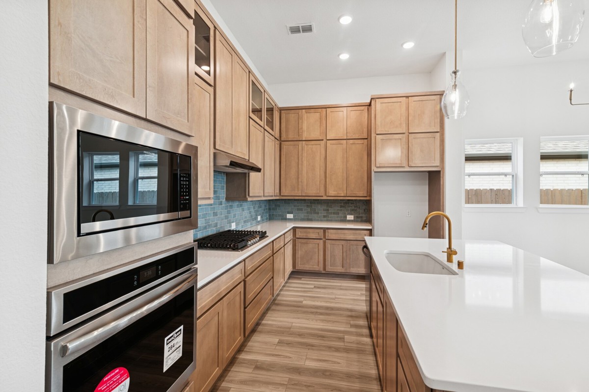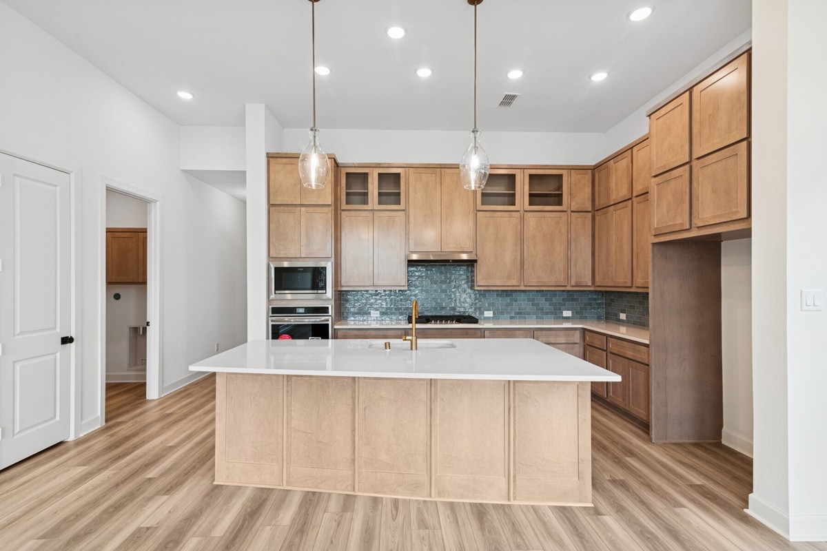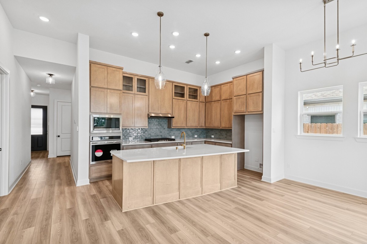 The open-concept living spaces offer a seamless flow between the family room, dining area, and gourmet kitchen—an entertainer’s dream. Floor-to-ceiling natural wood-finished cabinetry, LED undercabinet lighting, and an upgraded built-in appliance package elevate the kitchen, making it both stylish and highly functional.