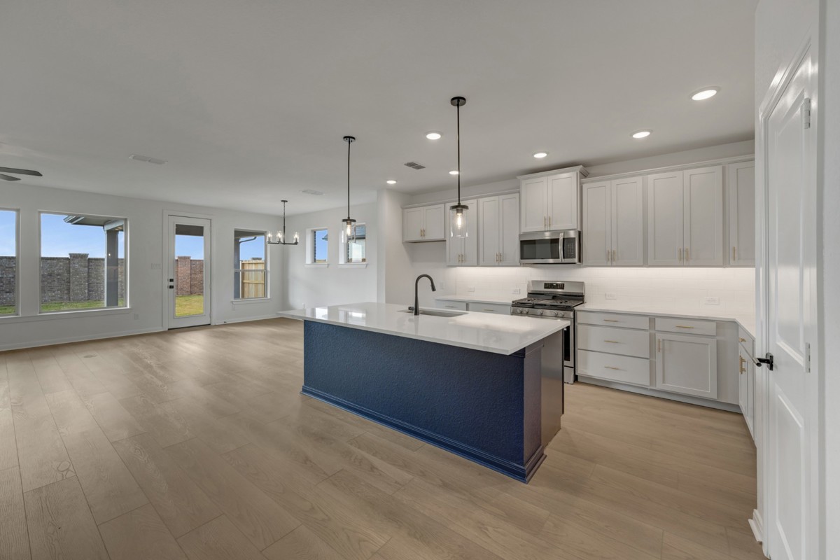 As you enter, you're greeted by a dedicated office/study—ideal for remote work or a quiet reading nook—and a convenient powder bath for guests. The heart of the home unfolds into a spacious open-concept living area, where the kitchen, family room, and dining room flow seamlessly together. The kitchen is a chef’s delight, featuring upgraded stainless steel appliances, under-cabinet lighting, a pullout trash drawer in the island, and an enormous walk-in pantry that cleverly extends under the stairs.