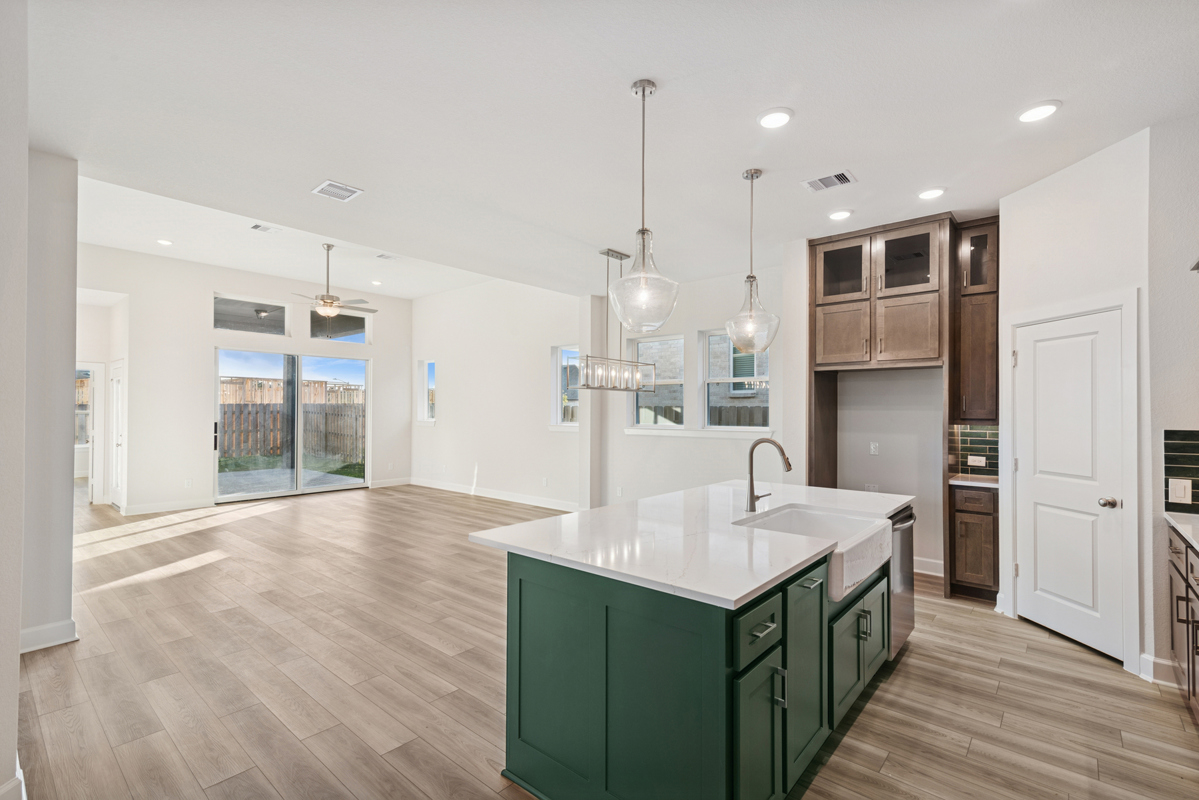 Thoughtful craftsmanship and enhanced everyday comfort come together beautifully in this David Weekley Conroe floor plan in COLTON. A charming front elevation welcomes you inside, where natural light fills the open-concept family, kitchen, and dining areas, showcasing designer selections, energy-efficient windows, and built-in appliances in the stunning kitchen.