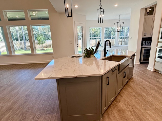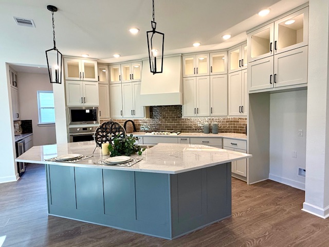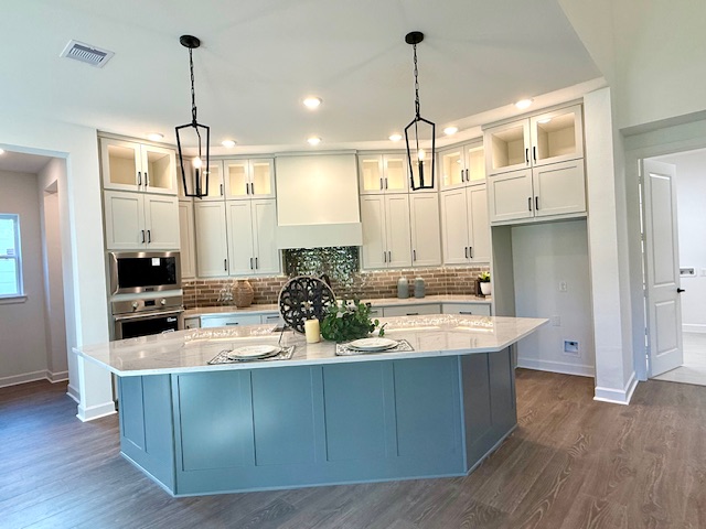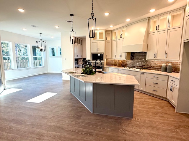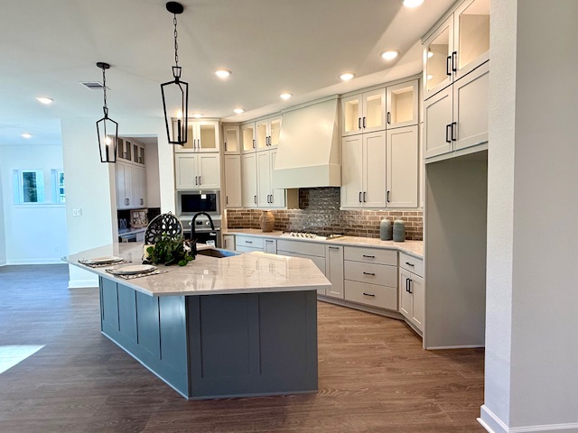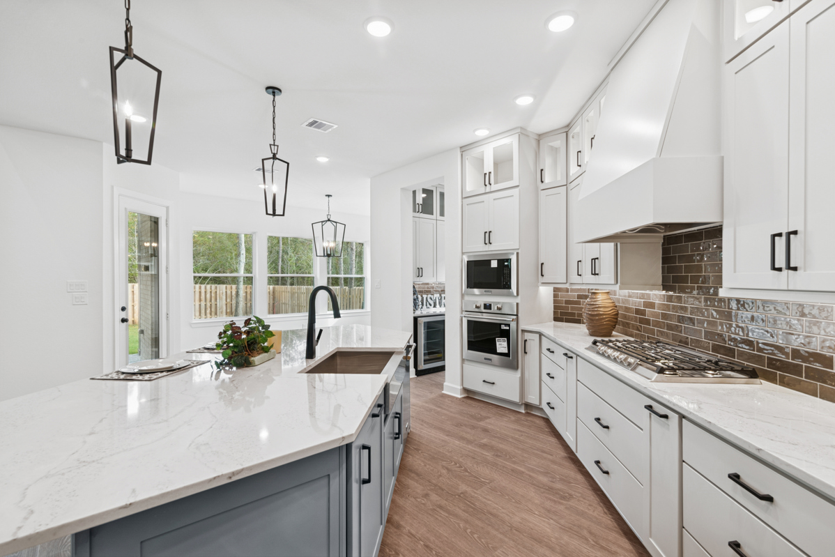 The oversized kitchen is a showpiece, with cabinetry that extends to the ceiling for a bold and sophisticated look. It includes soft-close drawers and doors, a farmhouse sink, built-in utensil drawer and spice rack, updraft vent hood, wine fridge, butler’s pantry, large walk-in pantry, and an oversized island—making it a dream for both cooking and entertaining.