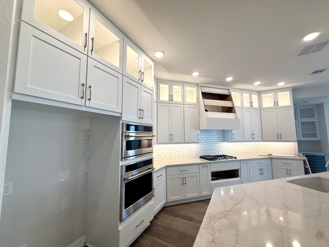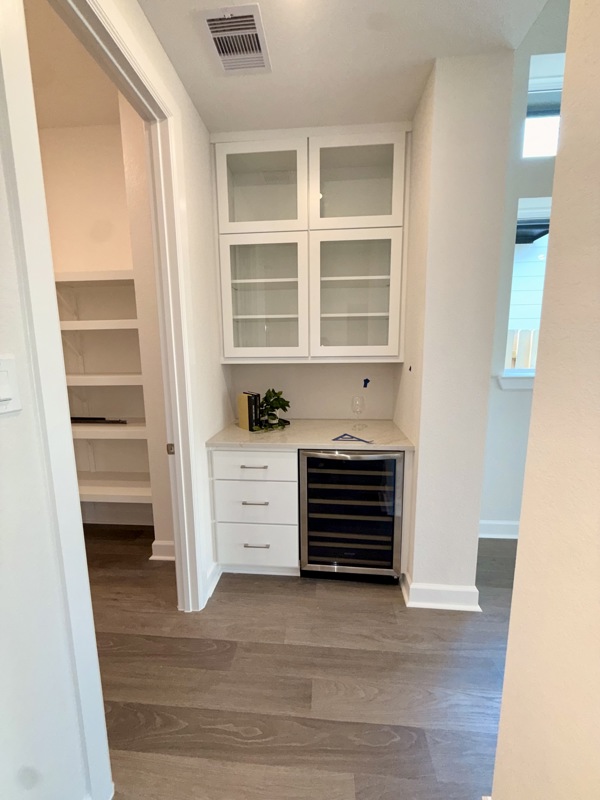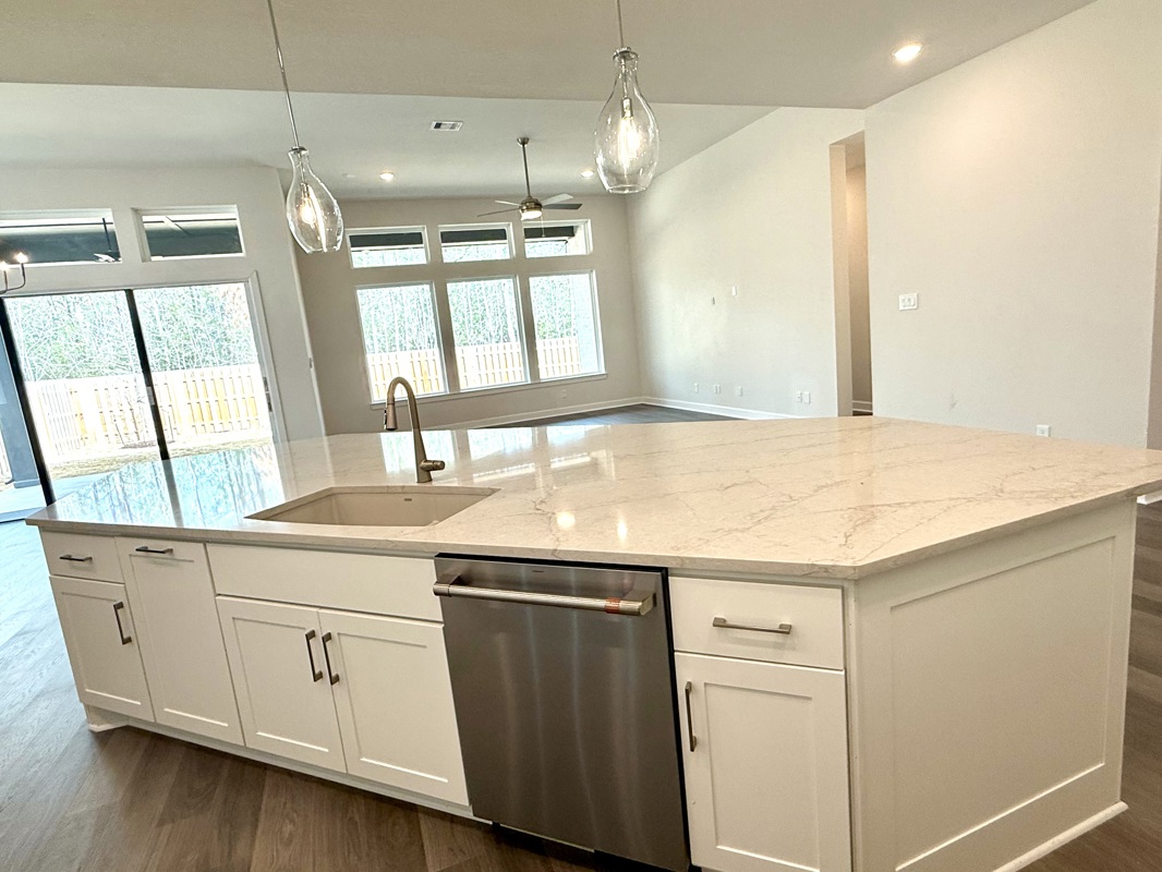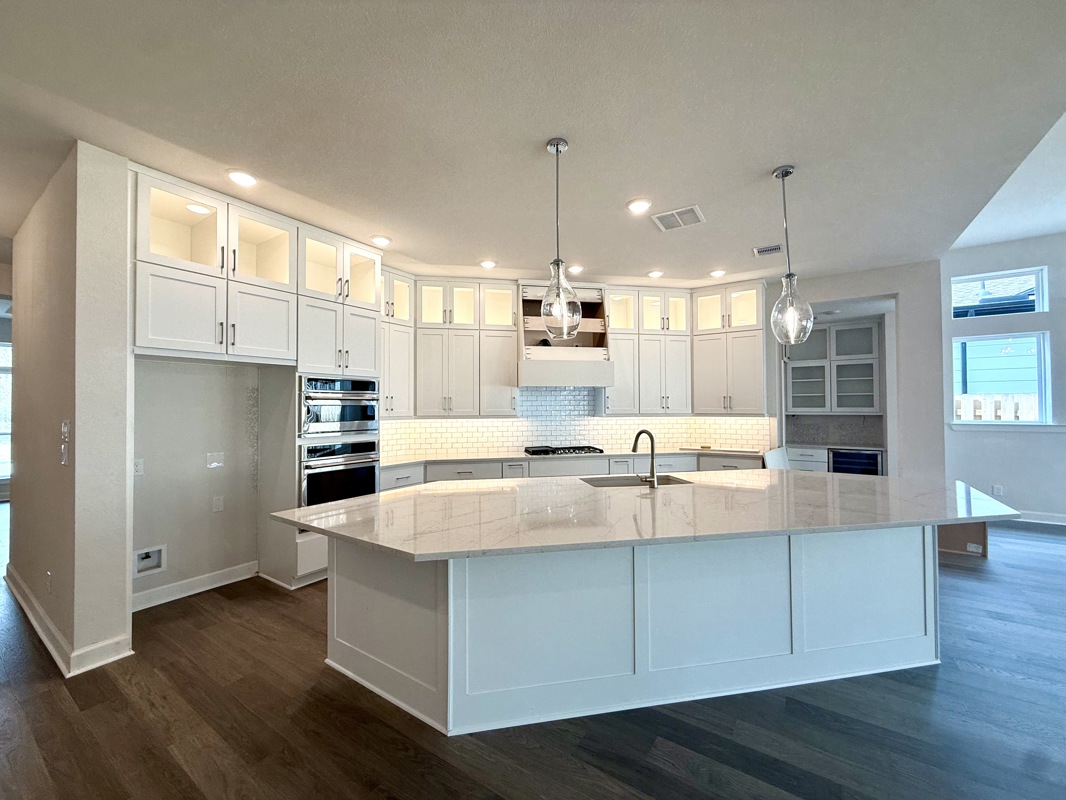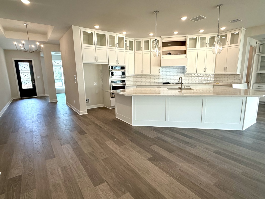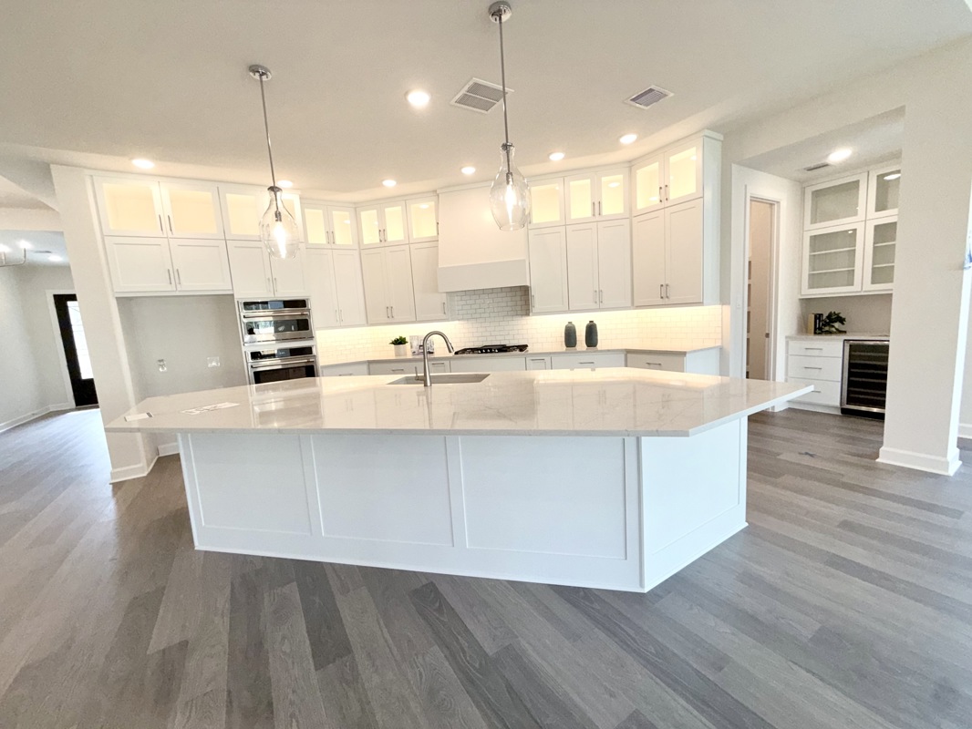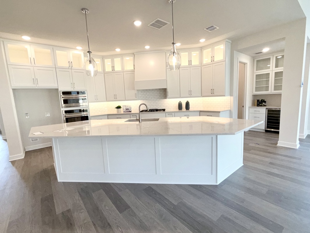 The chef’s kitchen is a dream, featuring a large island, quartz countertops, double ovens, and a walk in butler’s pantry complete with a wine fridge. It overlooks the expansive living area, where large picture windows frame views of the fully sodded rear yard.
