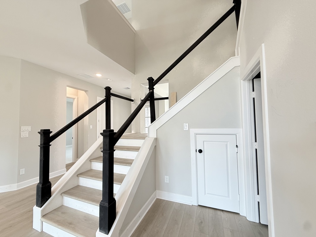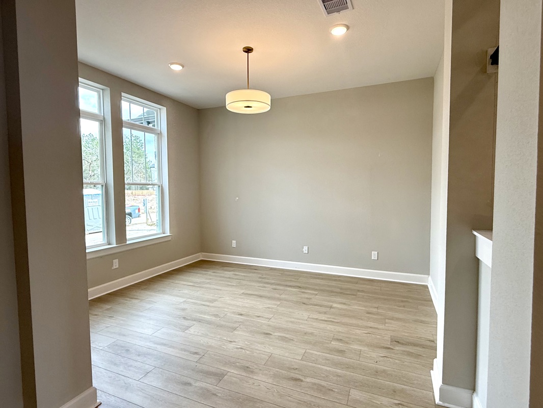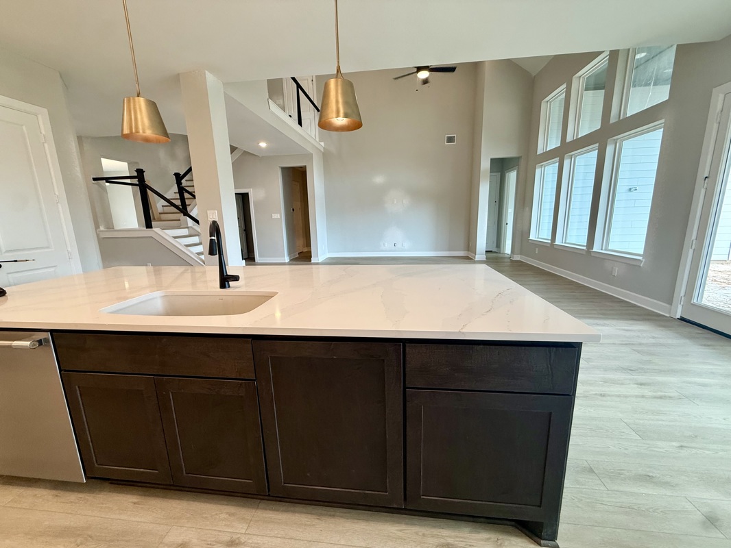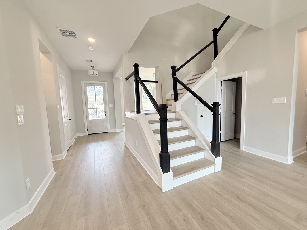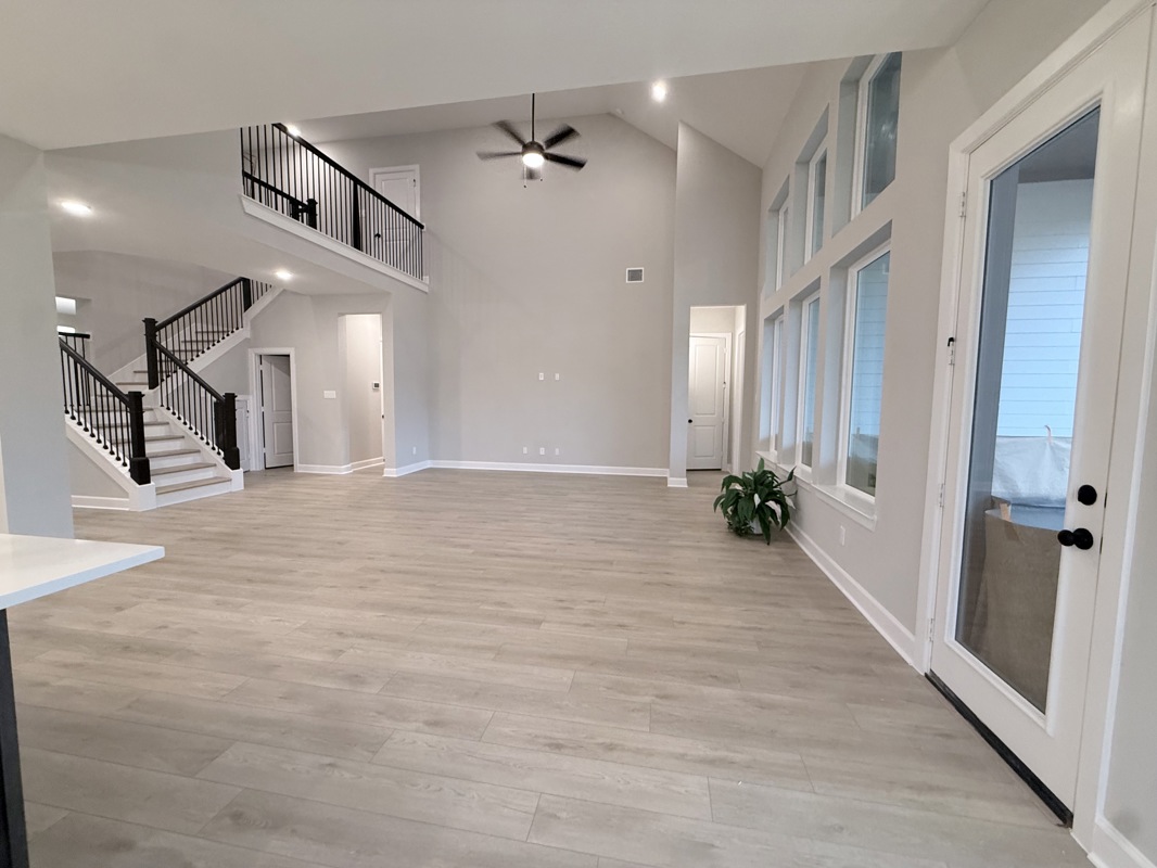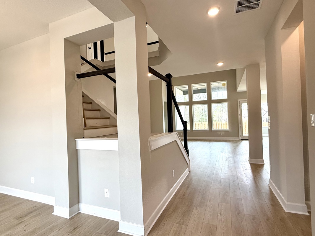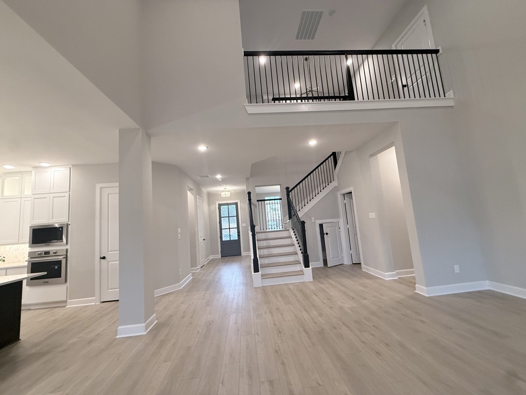 This beautiful 4-bedroom Sunflower by David Weekley Homes in COLTON 65 ft homes features a 2 story ceiling and large picture windows in the living area that flood the space with natural light. Low maintenance vinyl plank flooring enhances the Entry, Living, Dining, Kitchen, and Study for a cohesive and durable finish.