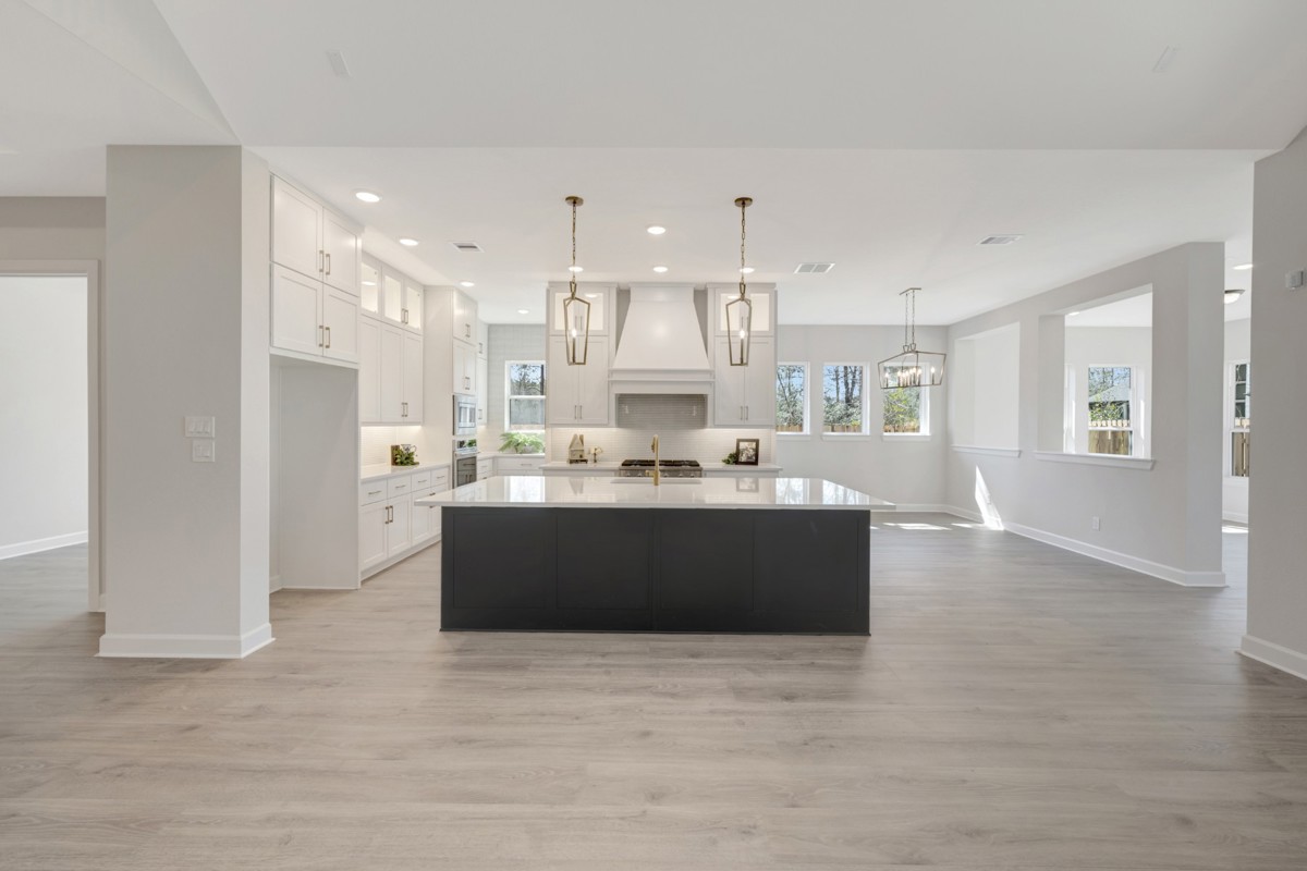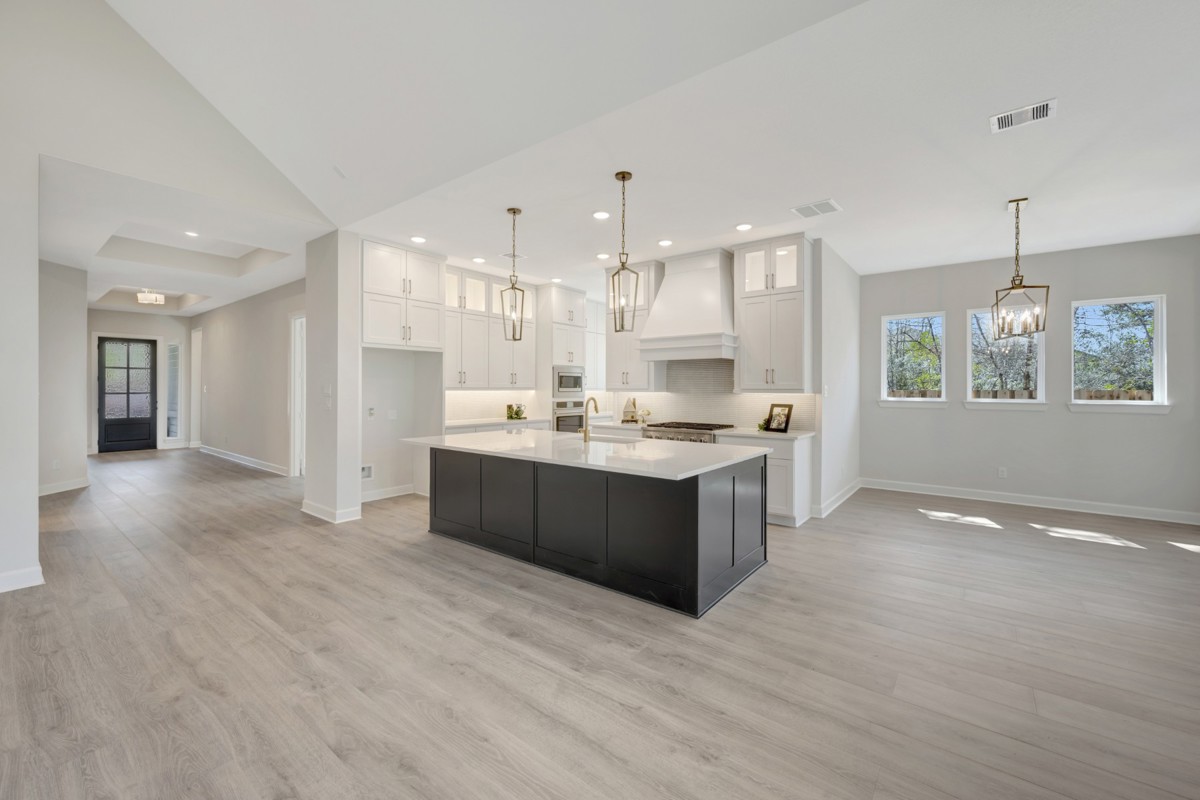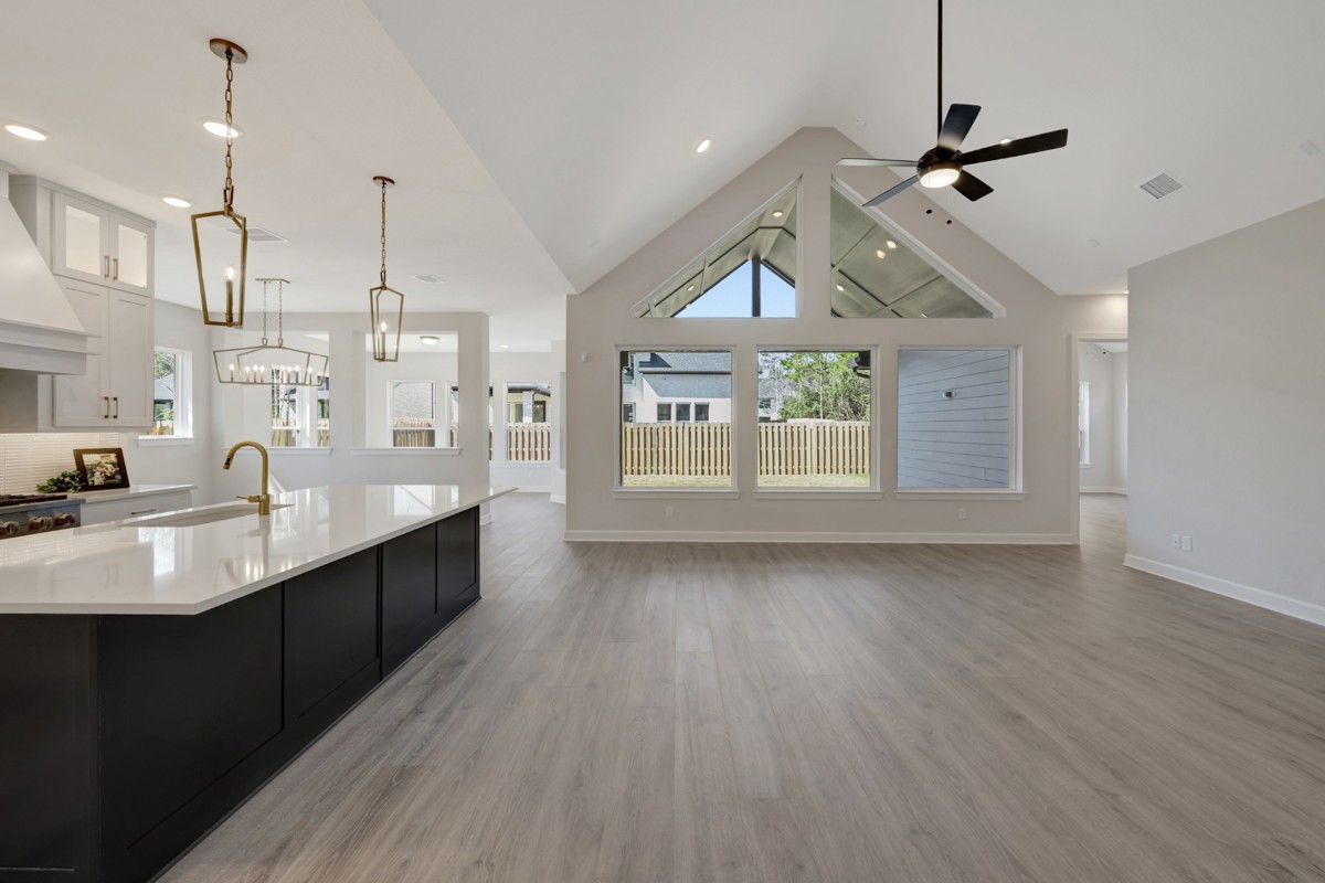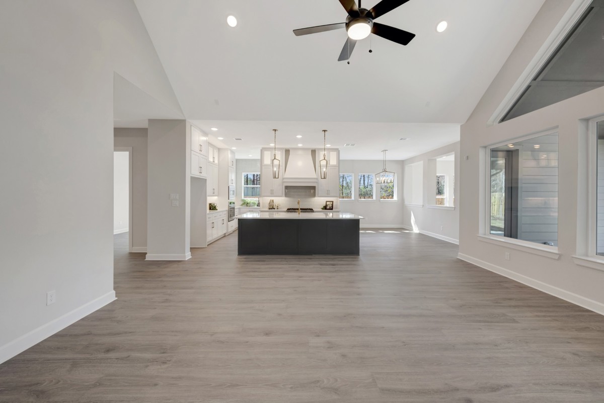 The large living room features a cathedral ceiling and huge picture windows across the rear of the home that open onto an expansive covered outdoor living area, also finished with a cathedral ceiling. The spacious kitchen includes cabinets to the ceiling, a large island with breakfast bar, and a walk in butler’s pantry that is sure to impress.