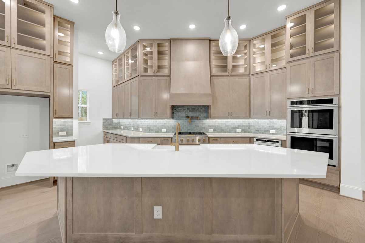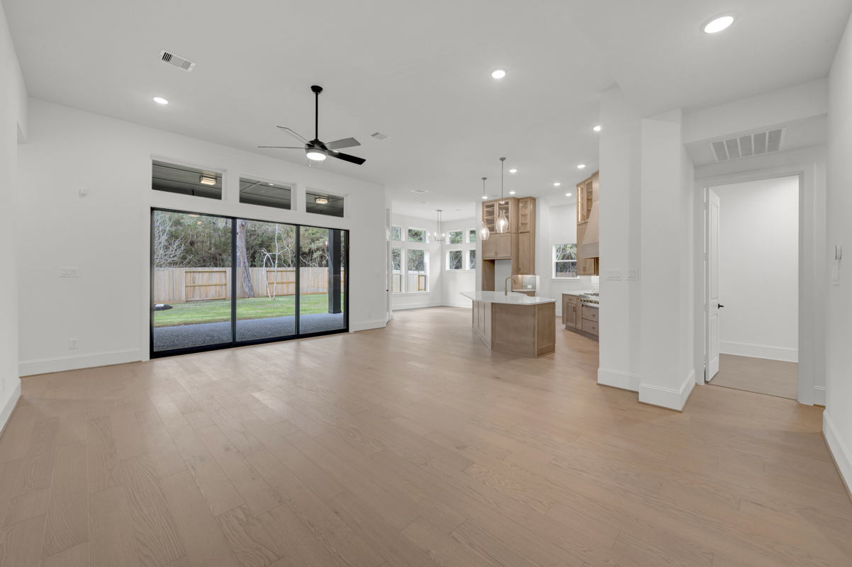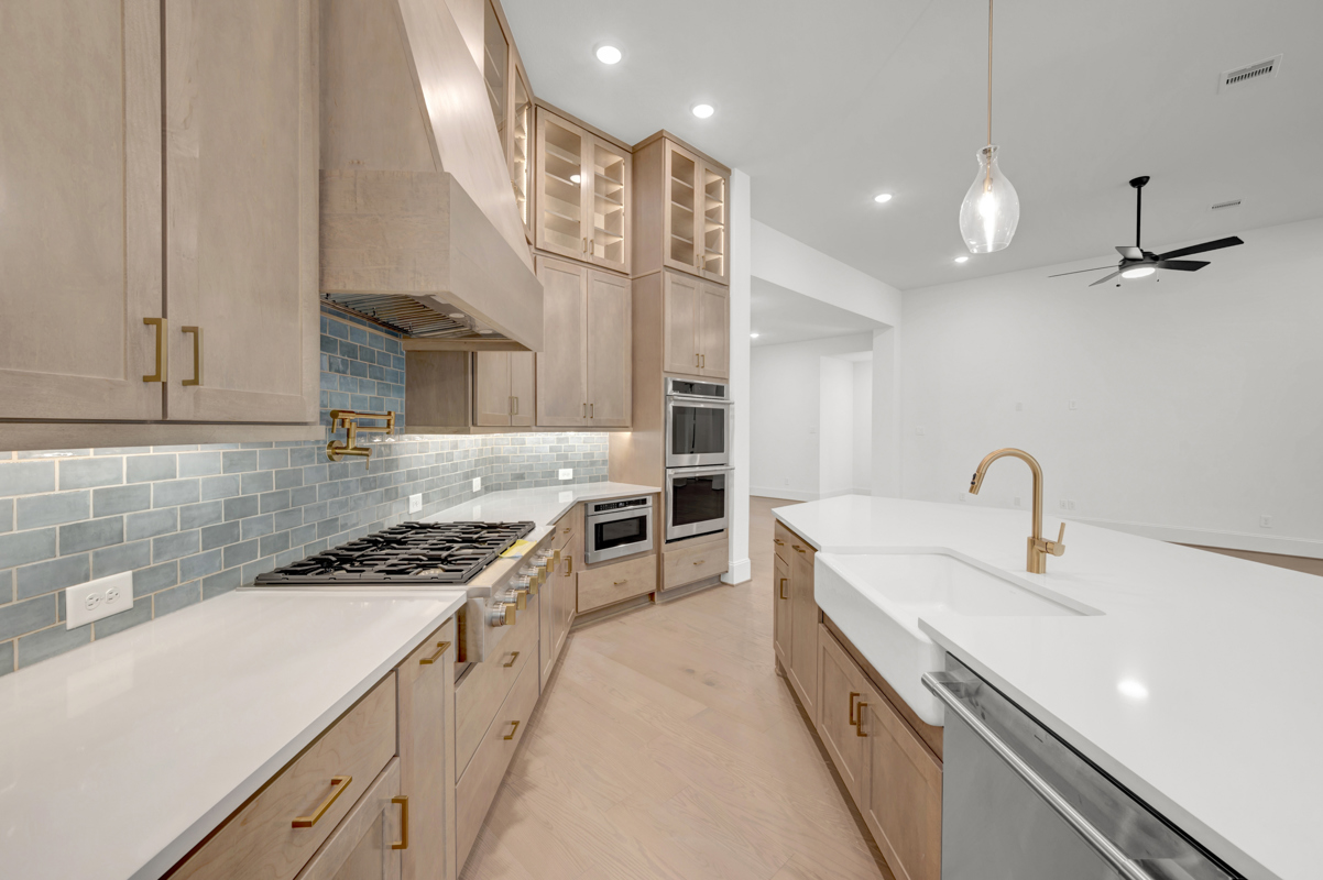 The heart of the home is sensational: an open-concept kitchen and family room bathed in natural light. Reclaimed driftwood-toned cabinetry, which pairs beautifully against the soft, misty backsplash & white quartz counters, subtly impresses - delivering that serene, natural vibe you’ve been dreaming of. Delight in the thoughtful details you love - Apron sink, pot filler, spice-racks, waste basket pull-out drawer, extended glass-front cabinets to the 12' ceilings, under-cabinet lighting + more. Gather the extended family around the oversized island during the holidays! Slide open the dramatic 12'-wide glass doors to reveal nearly 300 square feet of covered outdoor living - perfect for morning coffee or evenings under the Texas stars.