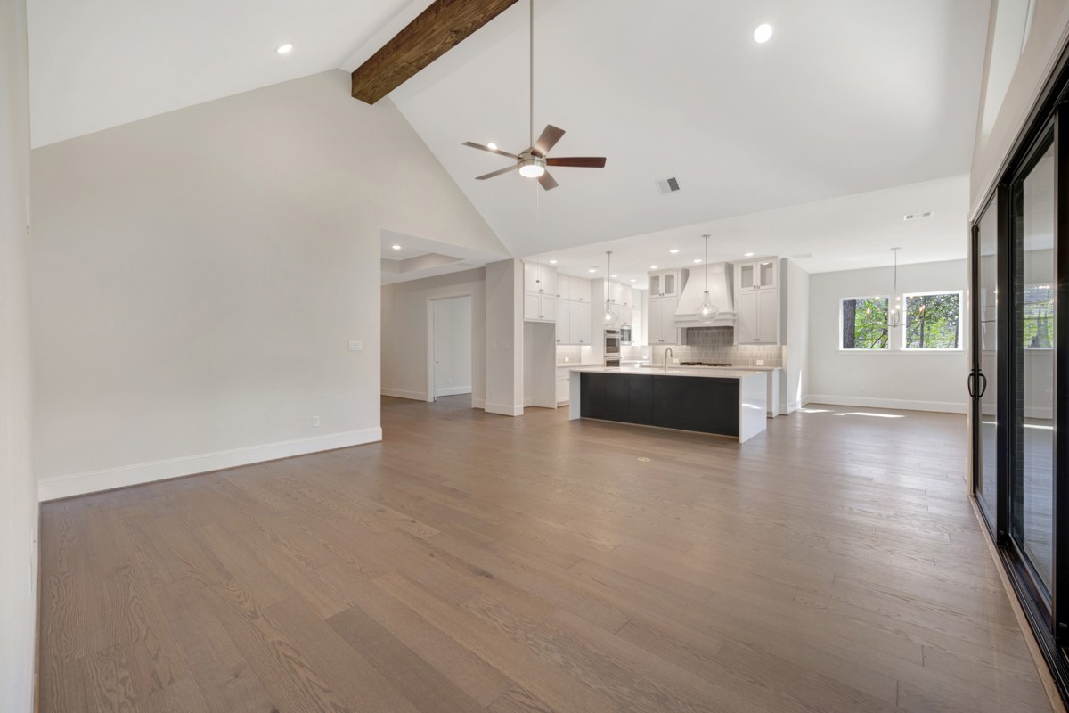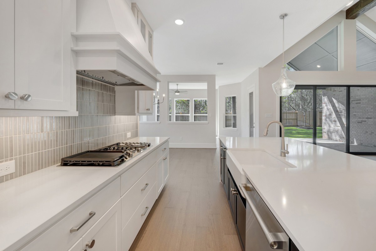 A sleek and classy black and white design collection adds modern elegance. The family room opens with 12-foot sliding glass doors to an extended covered patio. Cathedral ceilings in the family room and vaulted ceilings in the Owner’s Bedroom enhance the bright, airy atmosphere throughout.