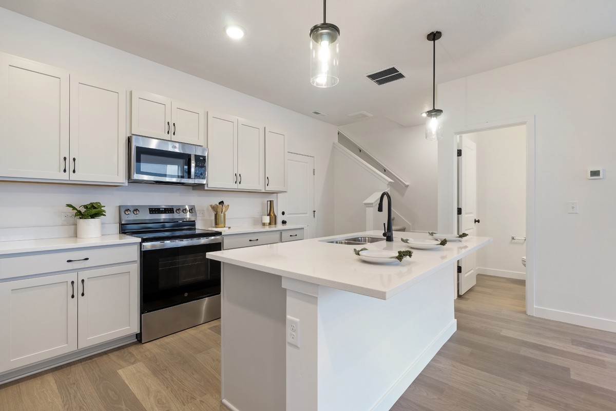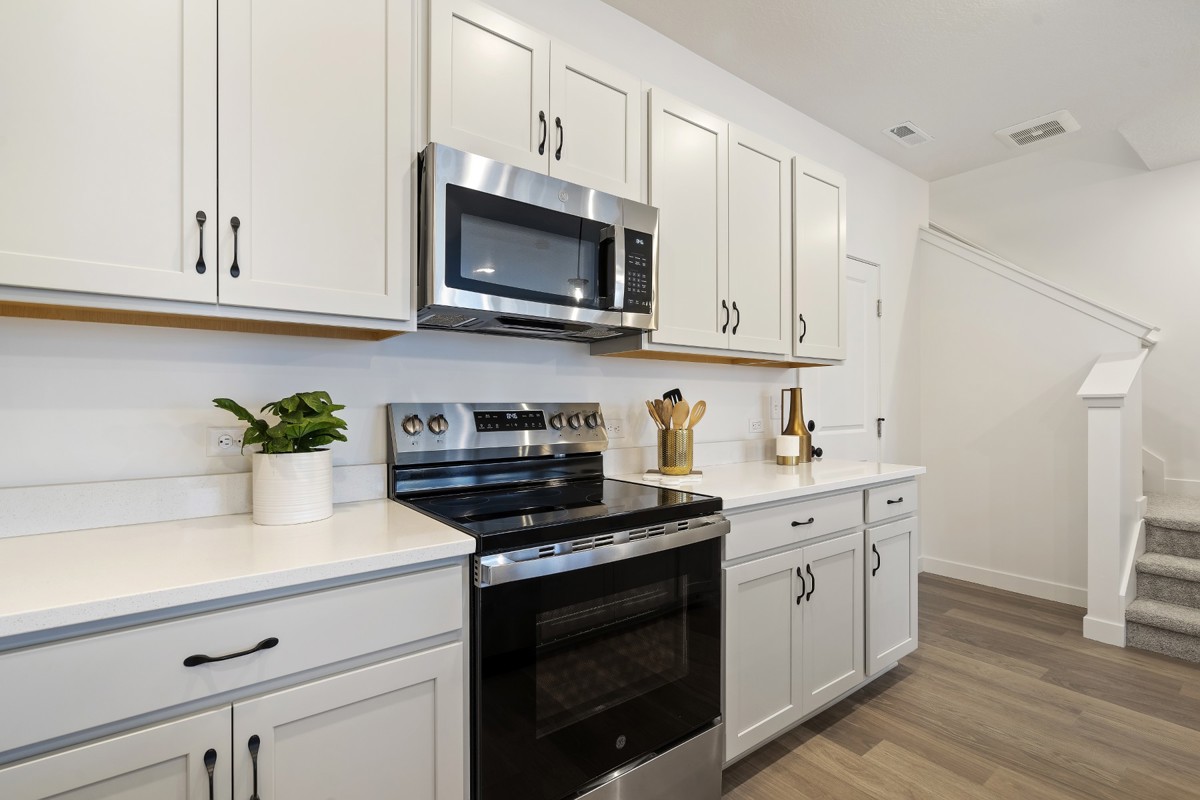 The open concept layout creates a seamless flow between the kitchen, dining area with large windows, and living room, making it ideal for entertaining and everyday life. Granite countertops pair beautifully with modern Harbor cabinetry to create a sophisticated kitchen space. Smart home features, including programmable thermostats and energy efficient appliances, add comfort and sustainability.