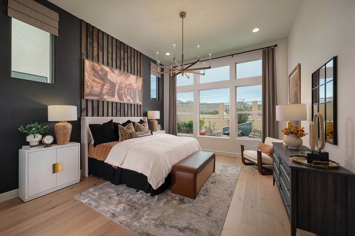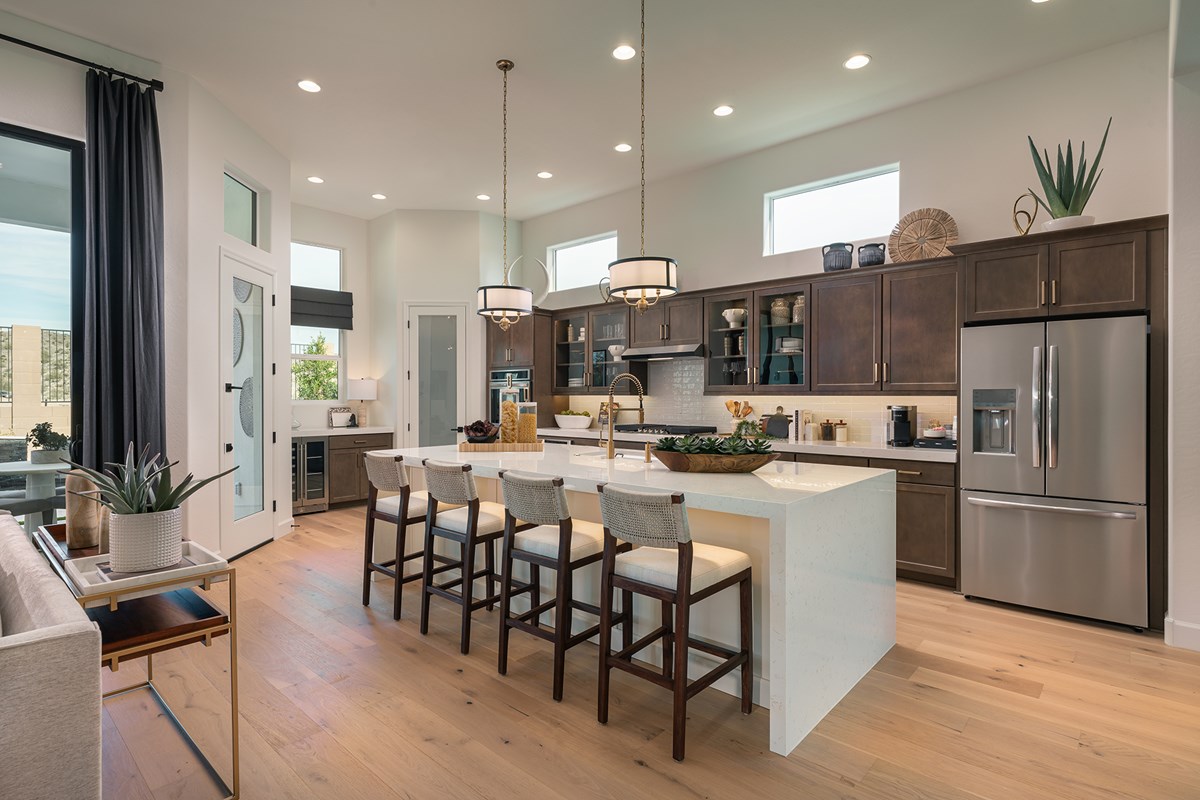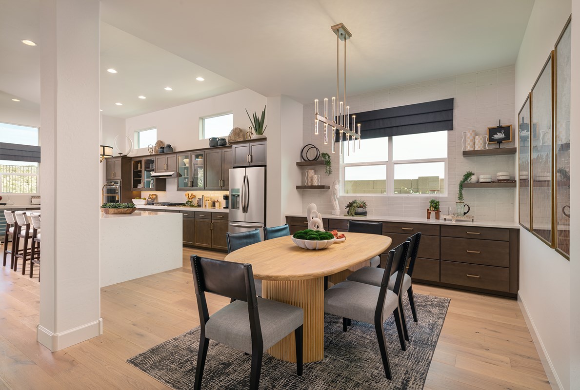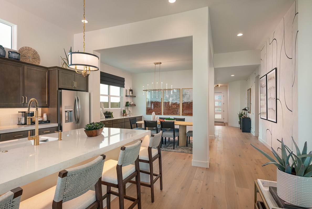 Comfort, style and luxury enhance every room of The Saltbush floor plan by David Weekley Homes in the West Phoenix area. Sunlight shines on the open-concept family and dining spaces thanks to the expertly proportioned windows overlooking the covered patio.