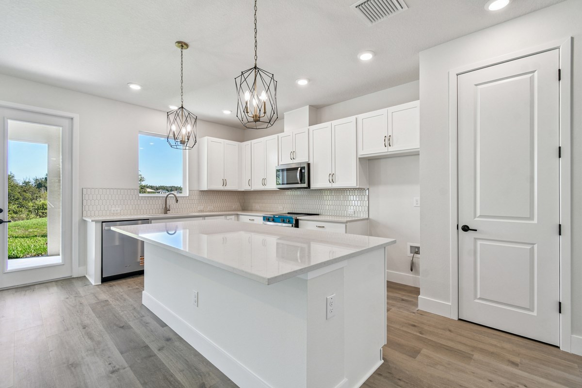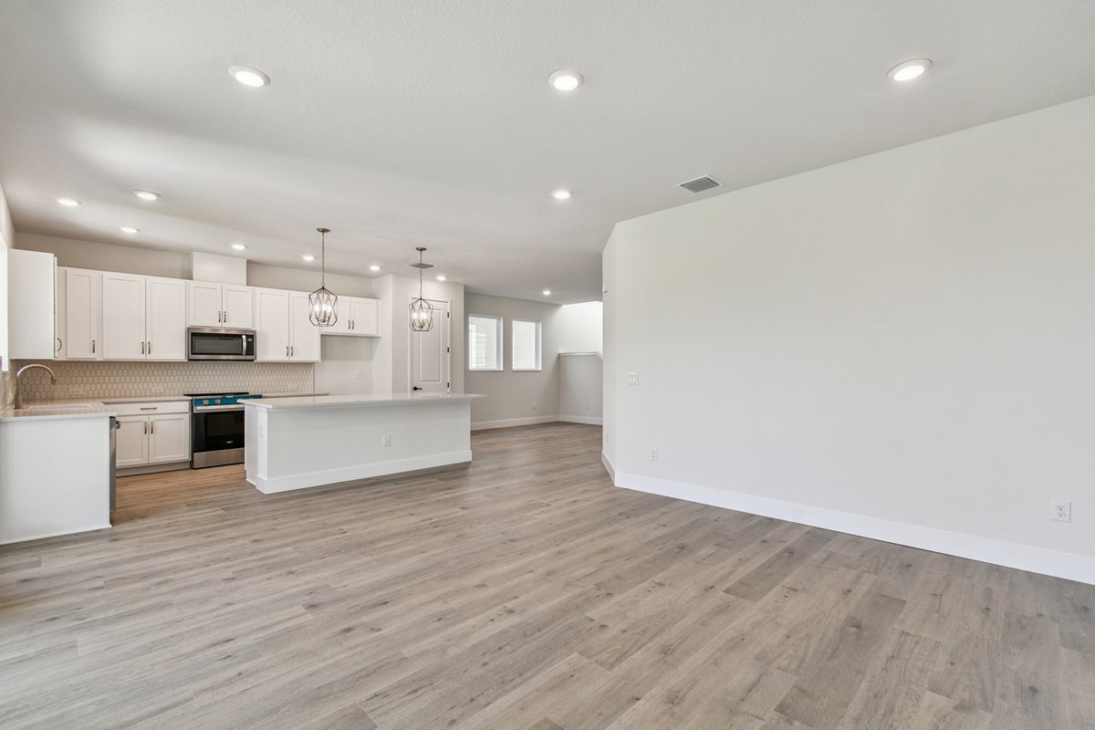 The open kitchen features a center island and an expansive view of the gathering spaces to enhance your culinary experience. Sunlight filters in through energy-efficient windows to shine on the open-concept family and dining areas on the first floor.