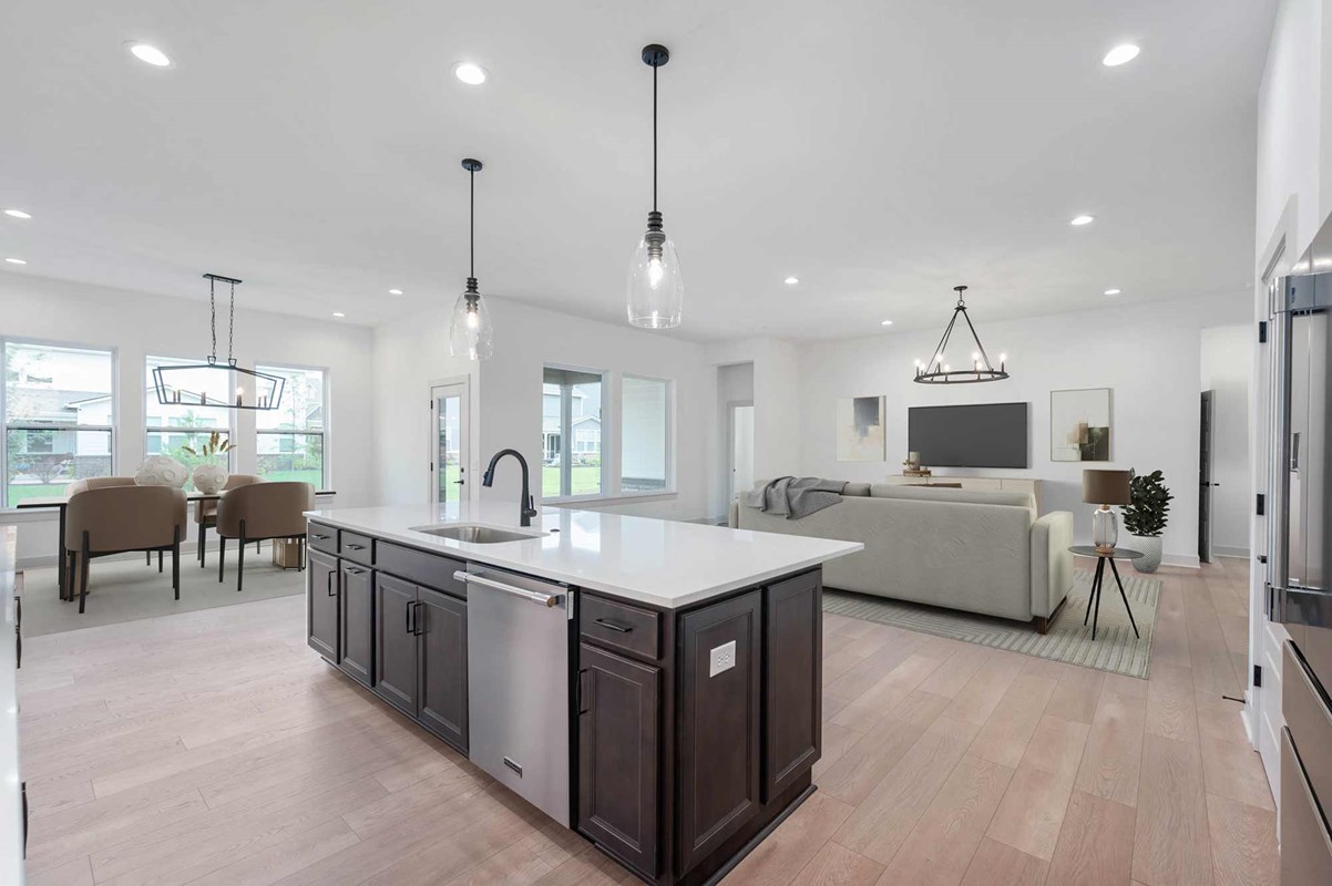 A tasteful kitchen rests at the heart of this home, balancing impressive style with easy function, all while maintaining an open design that flows throughout sunny family and dining areas.