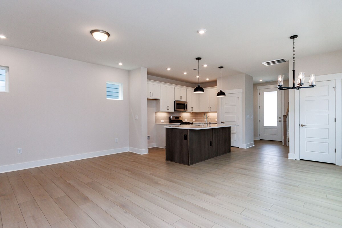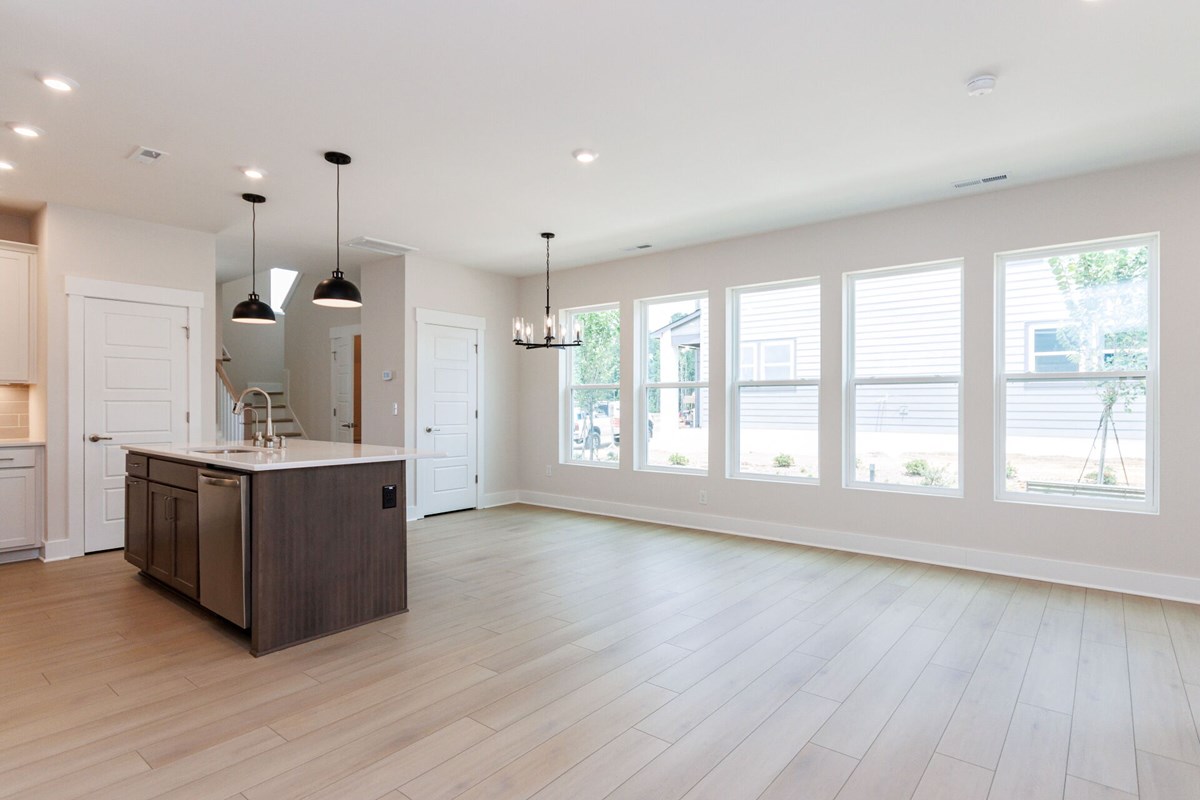 Coming home is the best part of every day with The Whitmer floor plan by David Weekley Homes in the West Raleigh area. The center island anchors the open kitchen’s views of sunny family and dining spaces.
