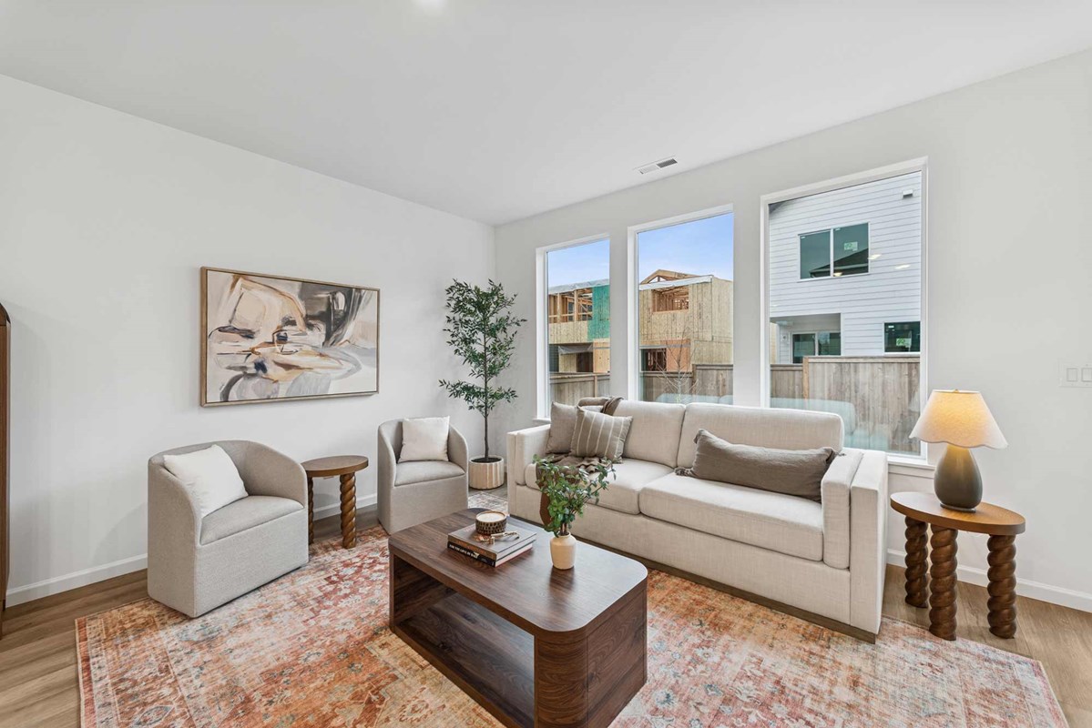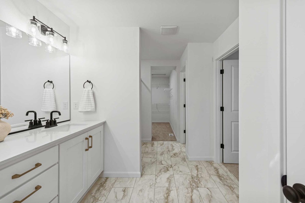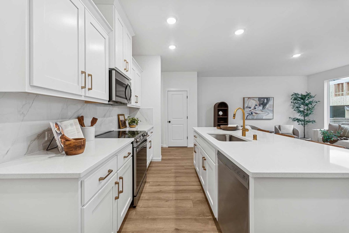The elegant kitchen showcases a center island and a grand view through the gathering spaces to the backyard. Start each day refreshed in the Owner’s Retreat, which includes a walk-in closet and a serene Owner’s Bath.